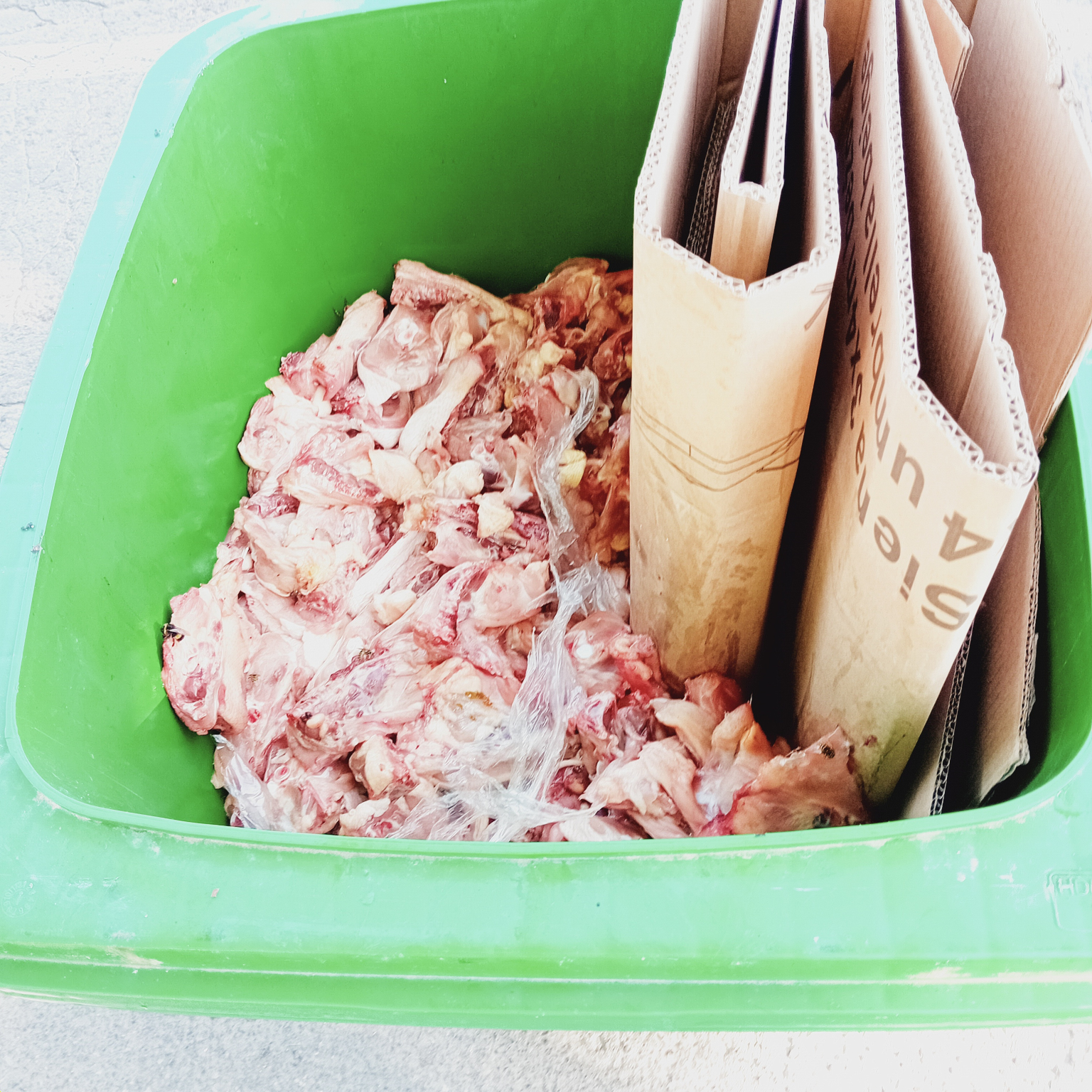 A IX. kerület Vágóhíd utca, Fehér holló utca 8 sarkára kitett kukában valaki egy nagy zacskó nyers húst rakott.