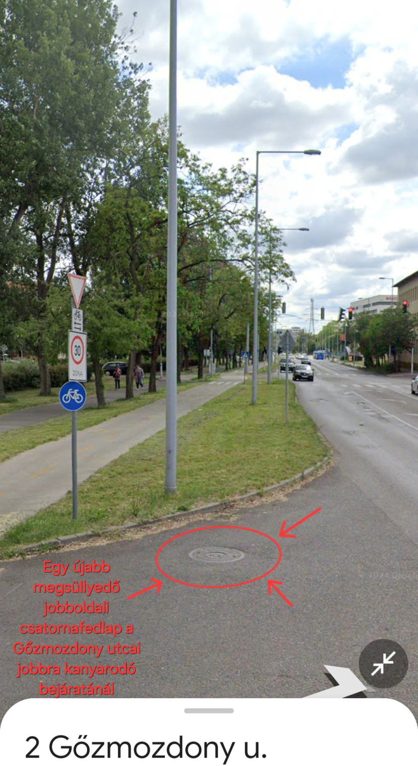 A Sibrik Miklós út vonalon 85 ös 85E, 68 as, 268 as és 117 es autóbusz vonala elhagyásával a Gőzmozdony utcai jobbra kanyarodva bejáratánál, 30 as zóna táblával szemben az egy darab jobboldali csatornafedlap újabb megsüllyedés látható ami kocsikon kilengéseken kellemetlenségett okozhat