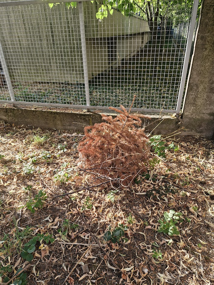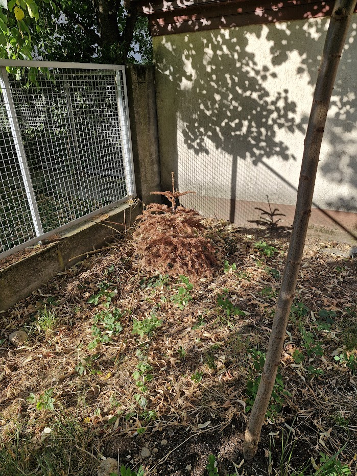 A Kövér Lajos téren kidobott karácsonyfa. Szürreális látvány 40 fokban.