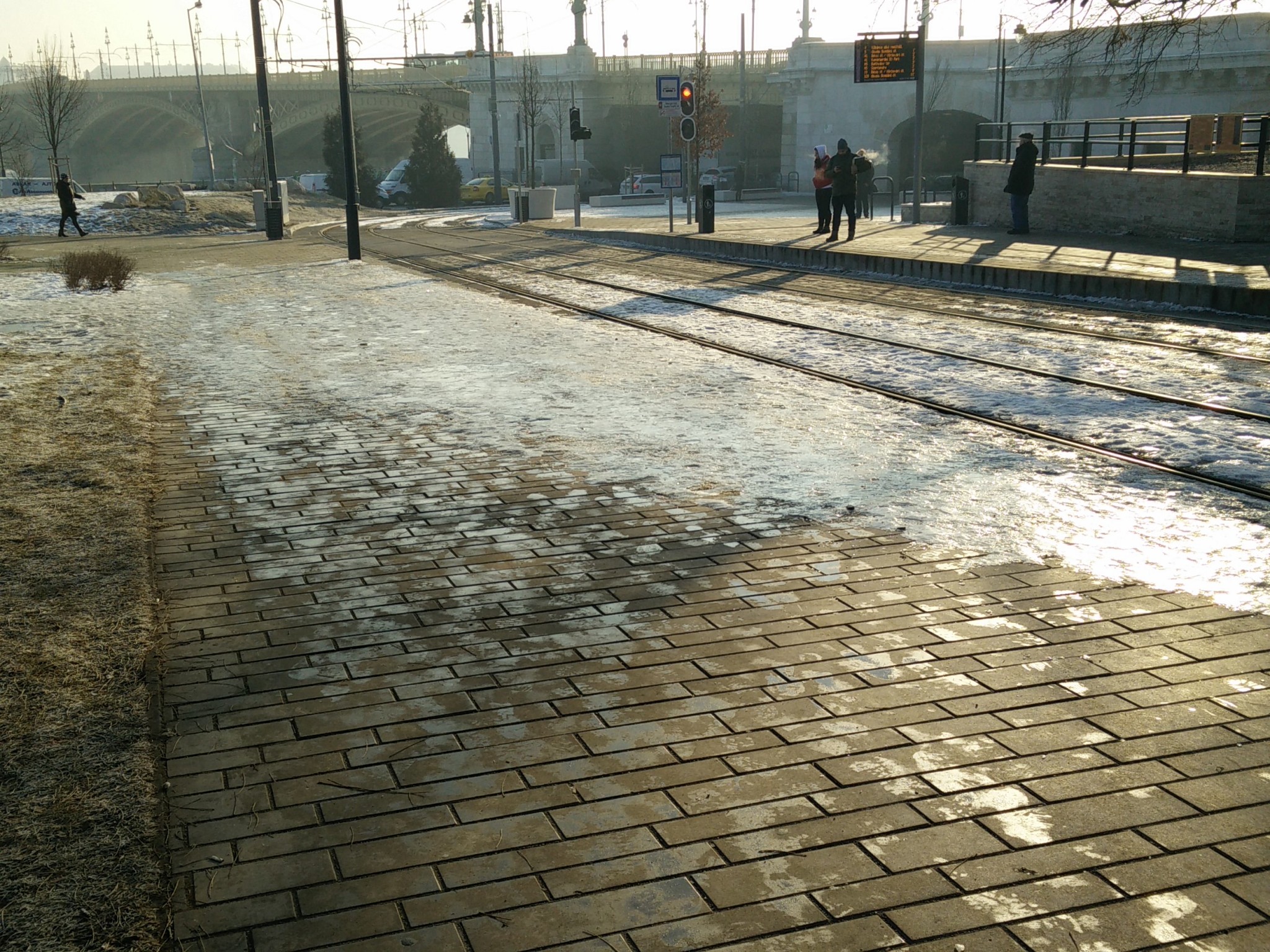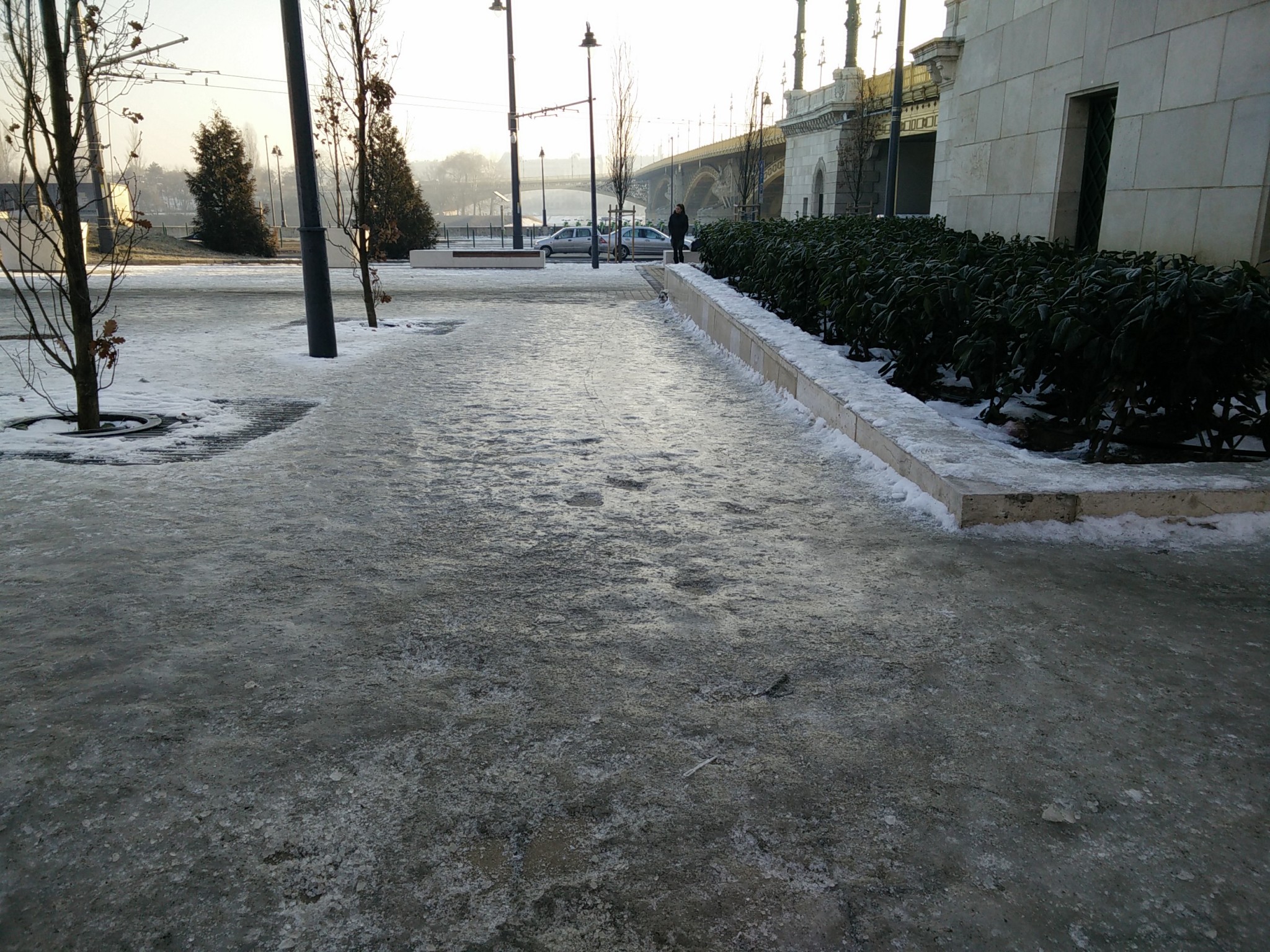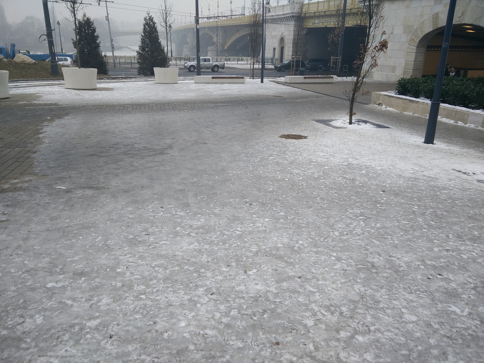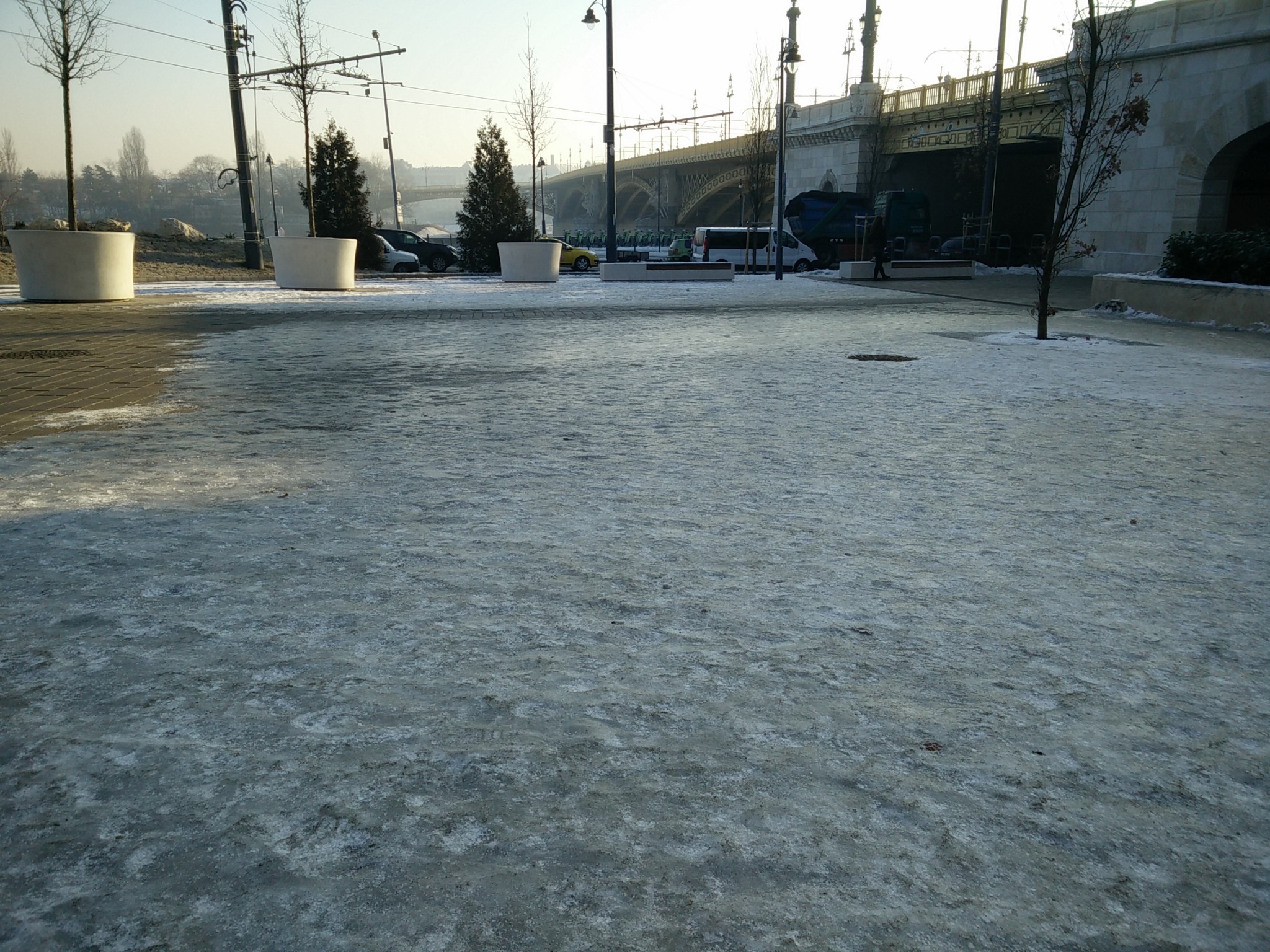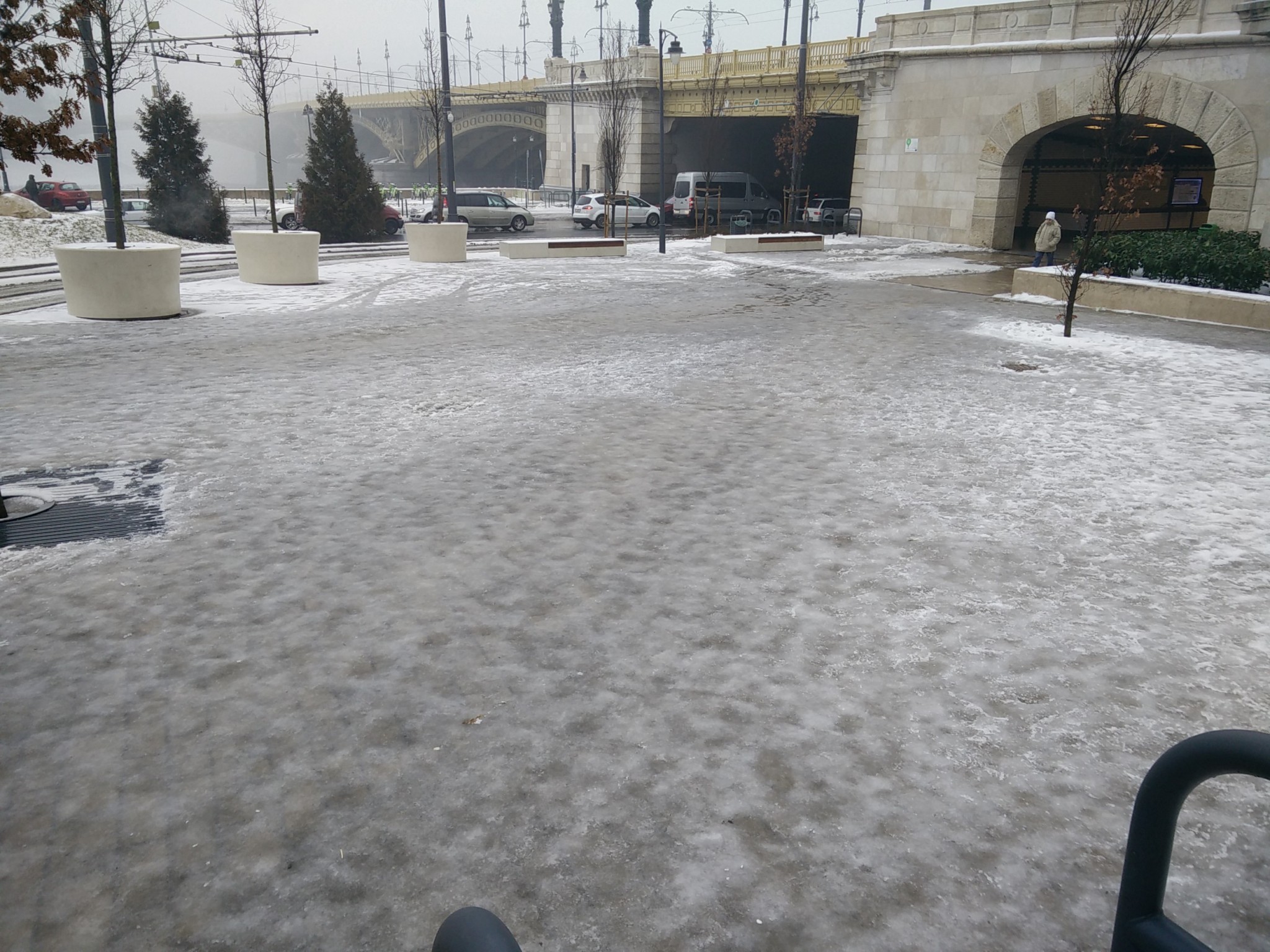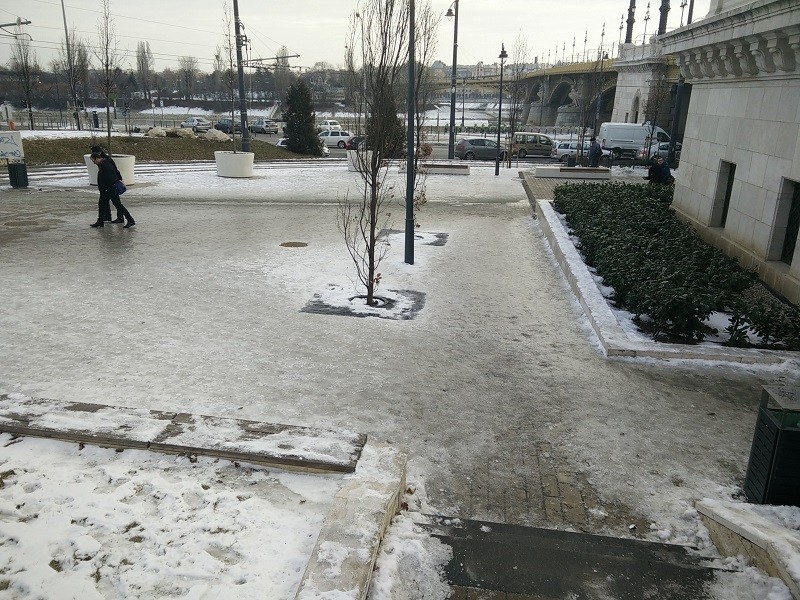 A Budapest Margit hid budai hidfonel talahato 19-es villamosmegallonal a jarda tobb helyen nincs megfeleloen takaritva, ezert jeges, csuszos.