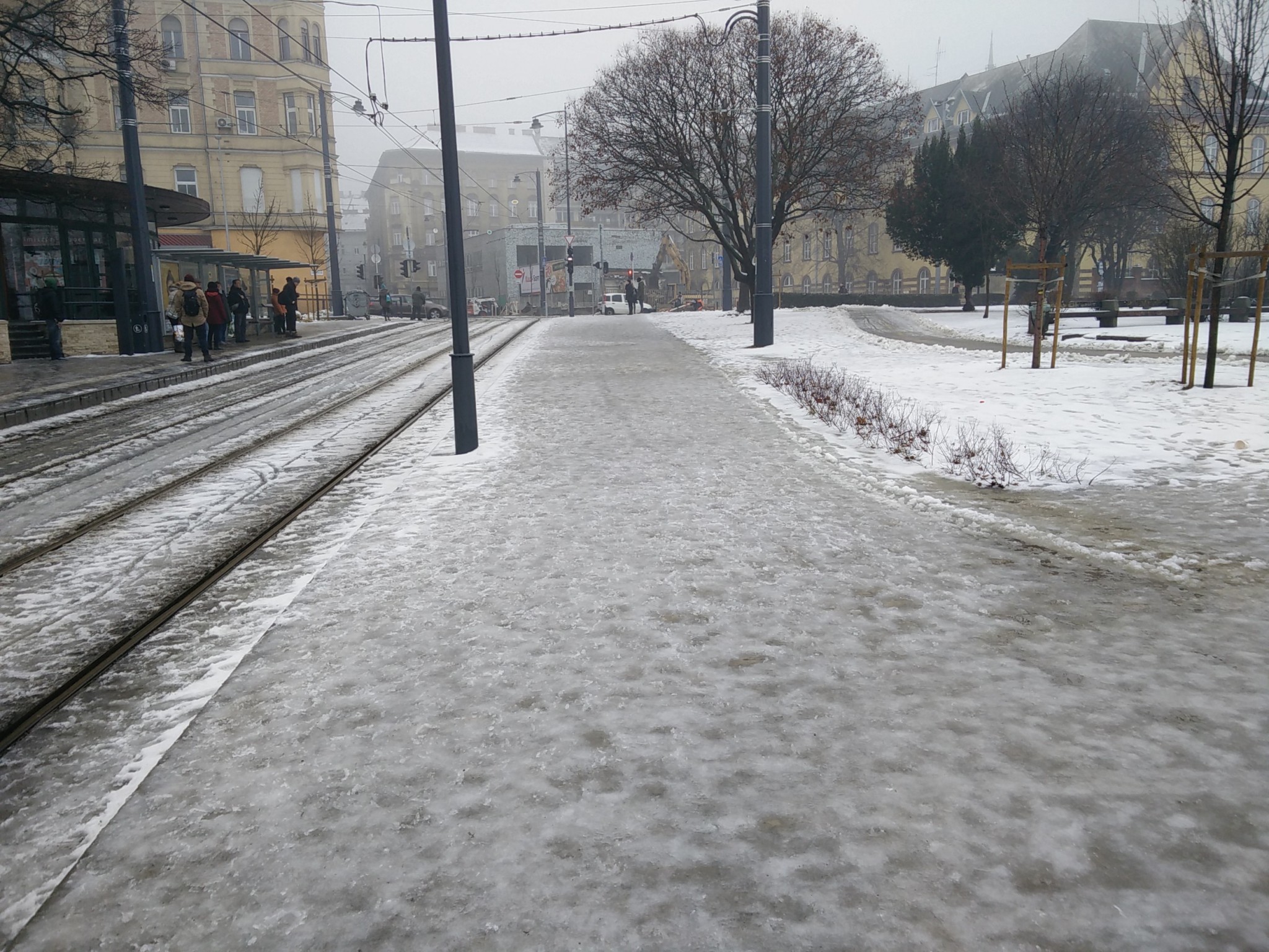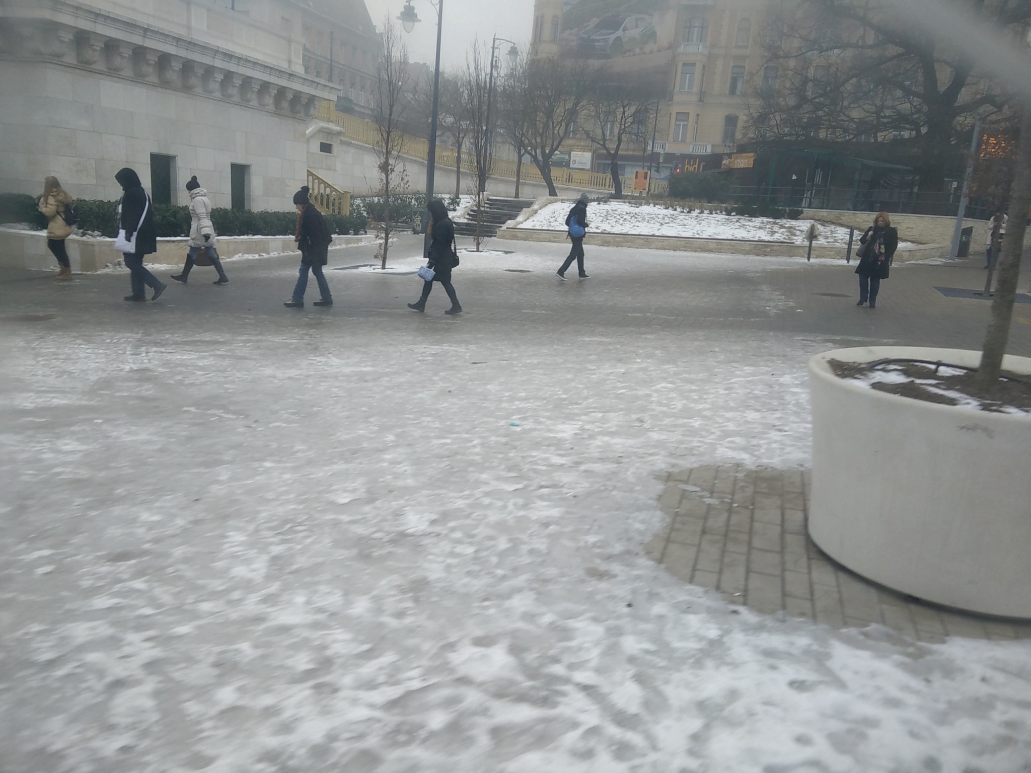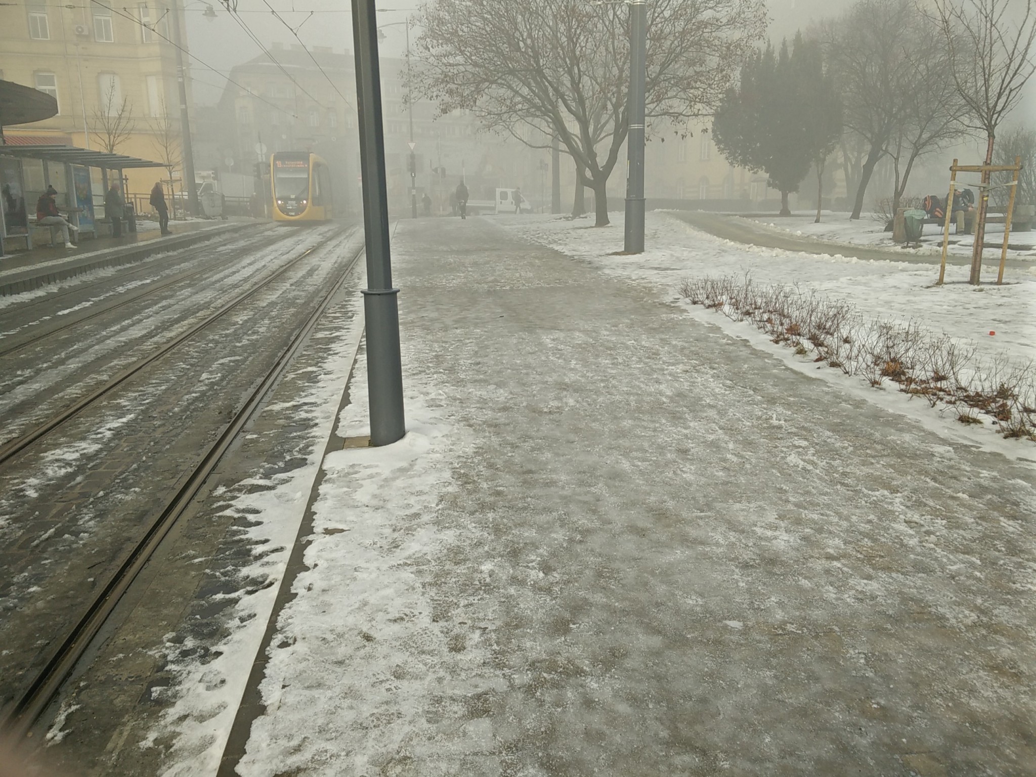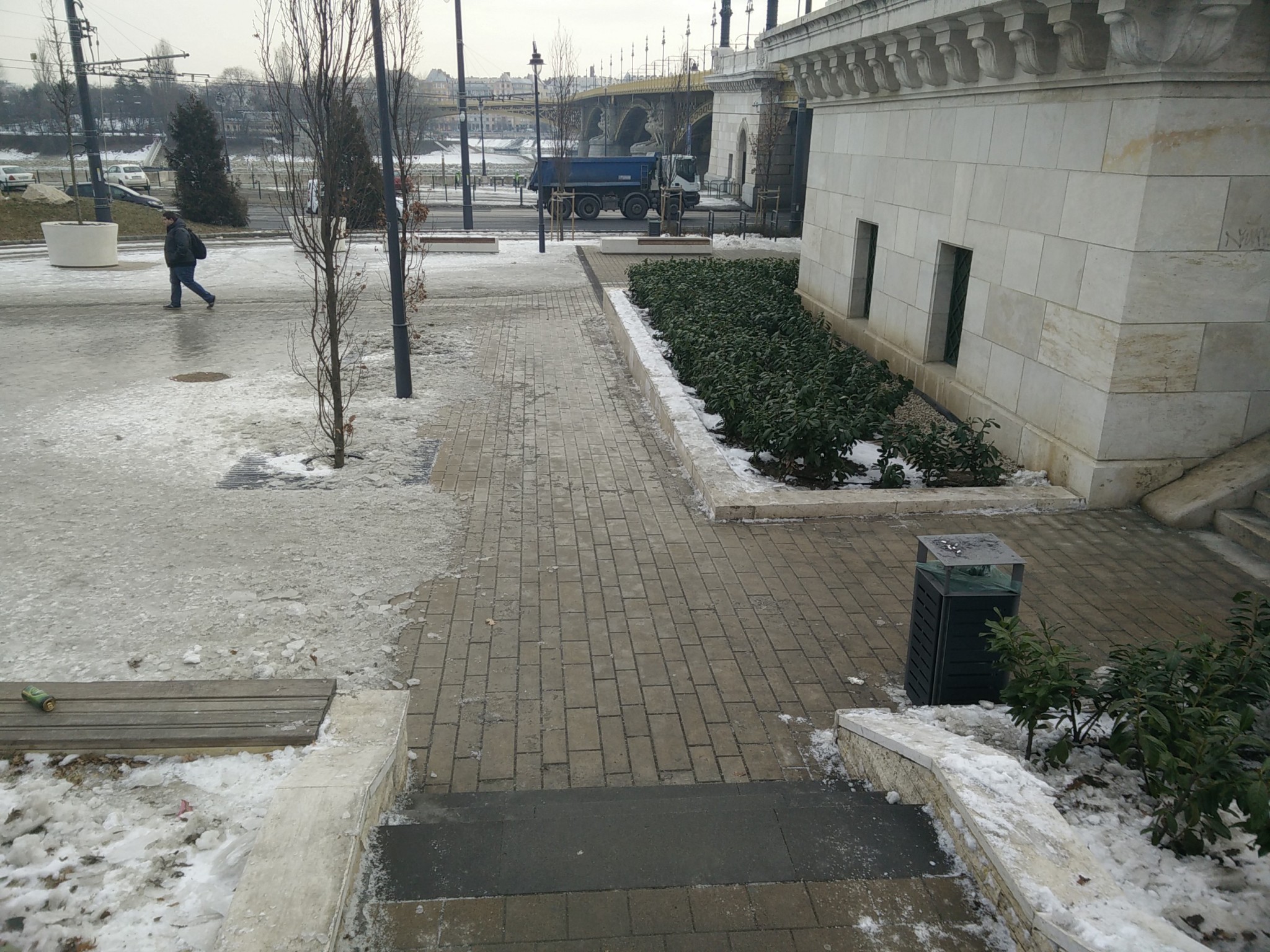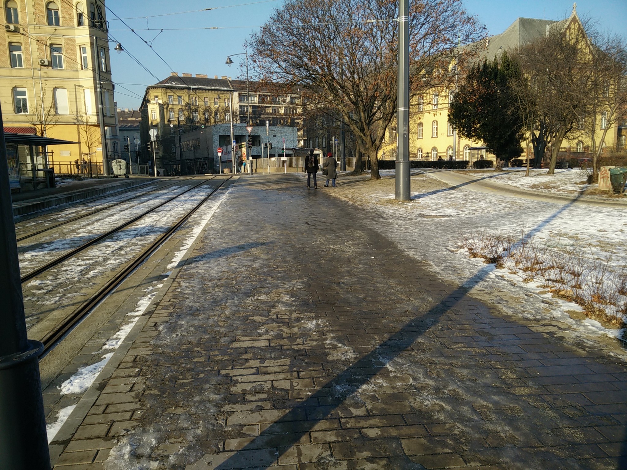 A Budapest Margit hid budai hidfonel talahato 19-es villamosmegallonal a jarda tobb helyen nincs megfeleloen takaritva, ezert jeges, csuszos.