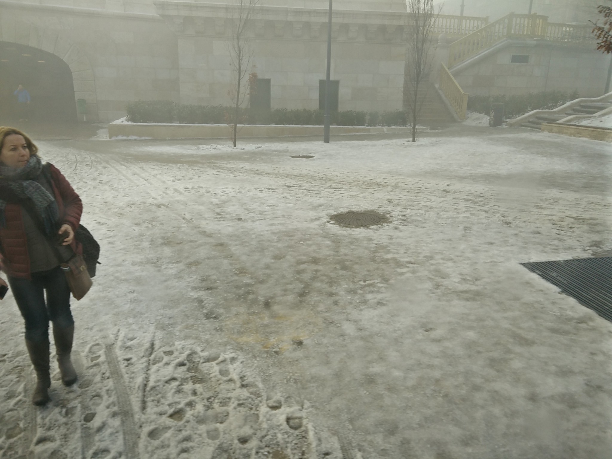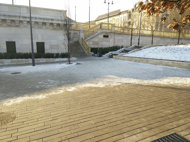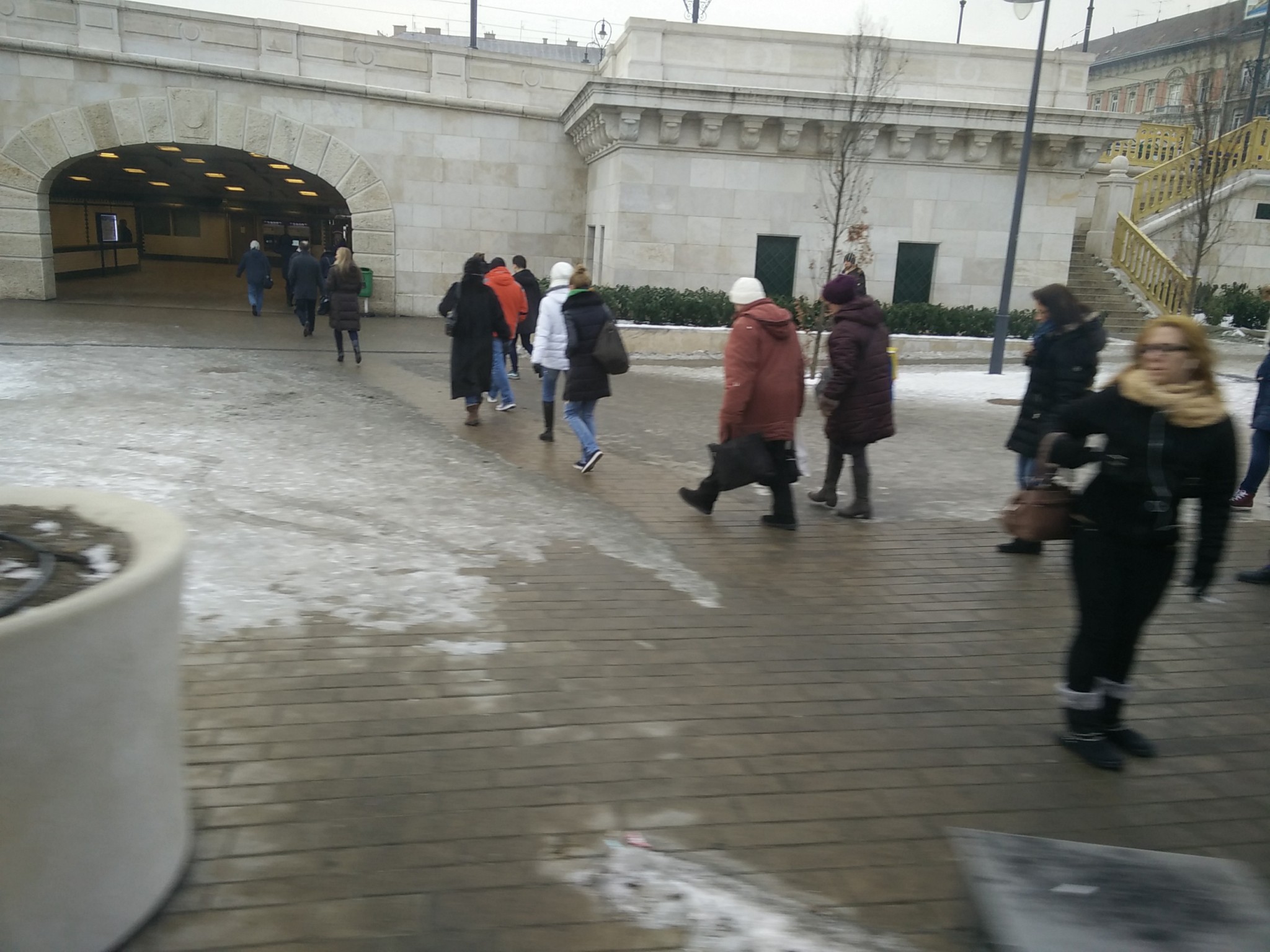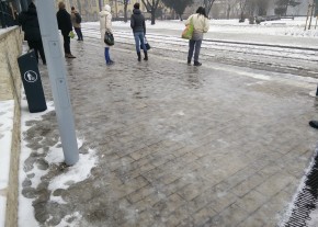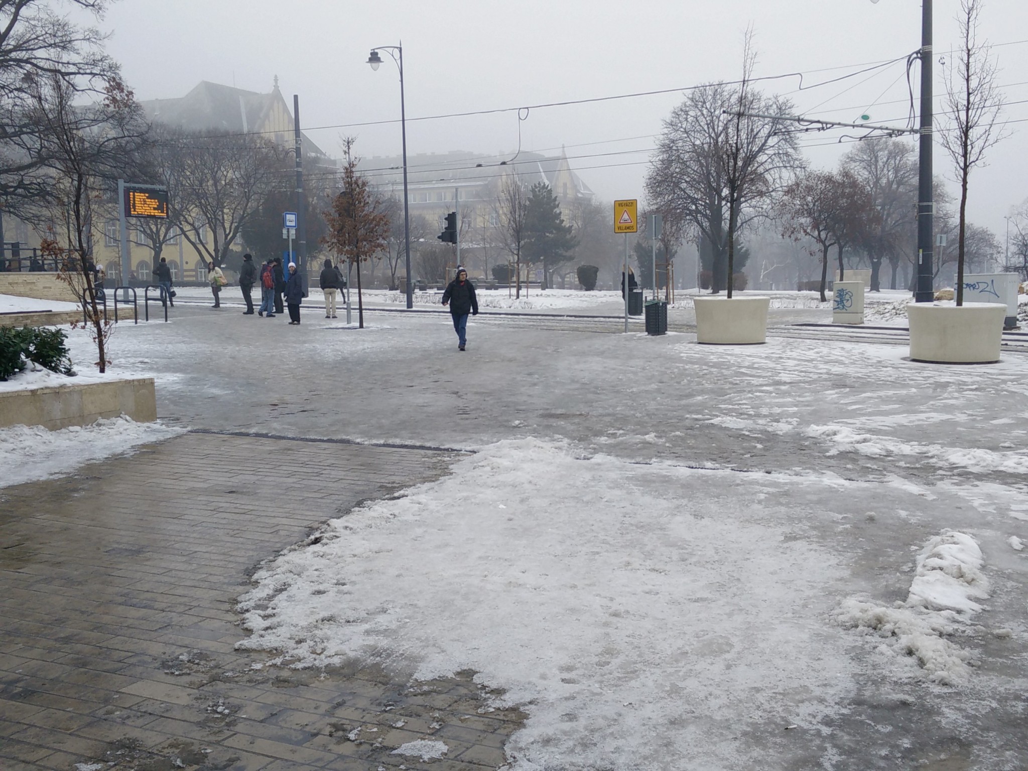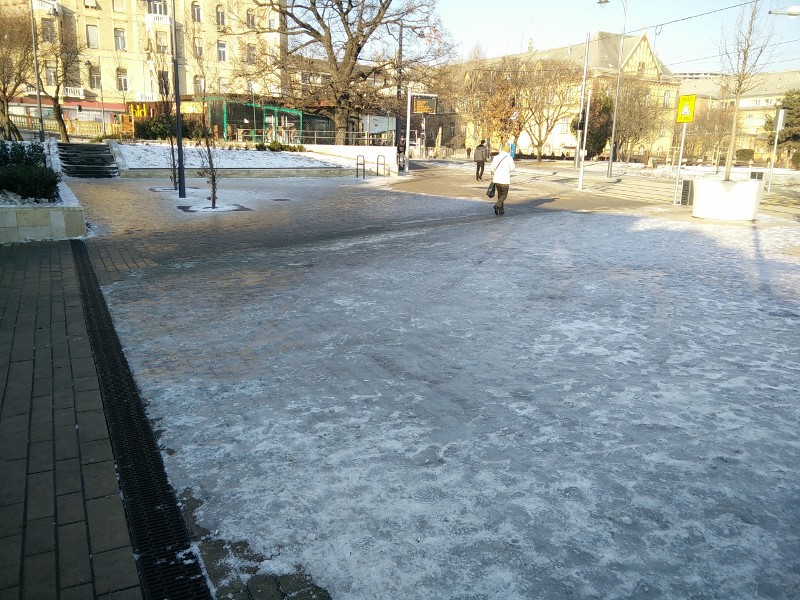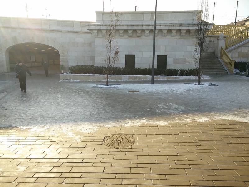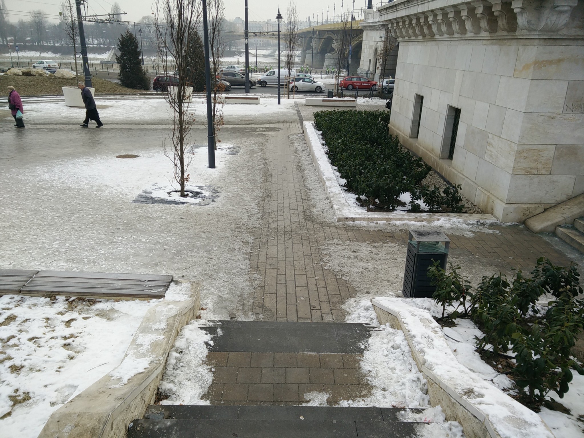 A Budapest Margit hid budai hidfonel talahato 19-es villamosmegallonal a jarda tobb helyen nincs megfeleloen takaritva, ezert jeges, csuszos.