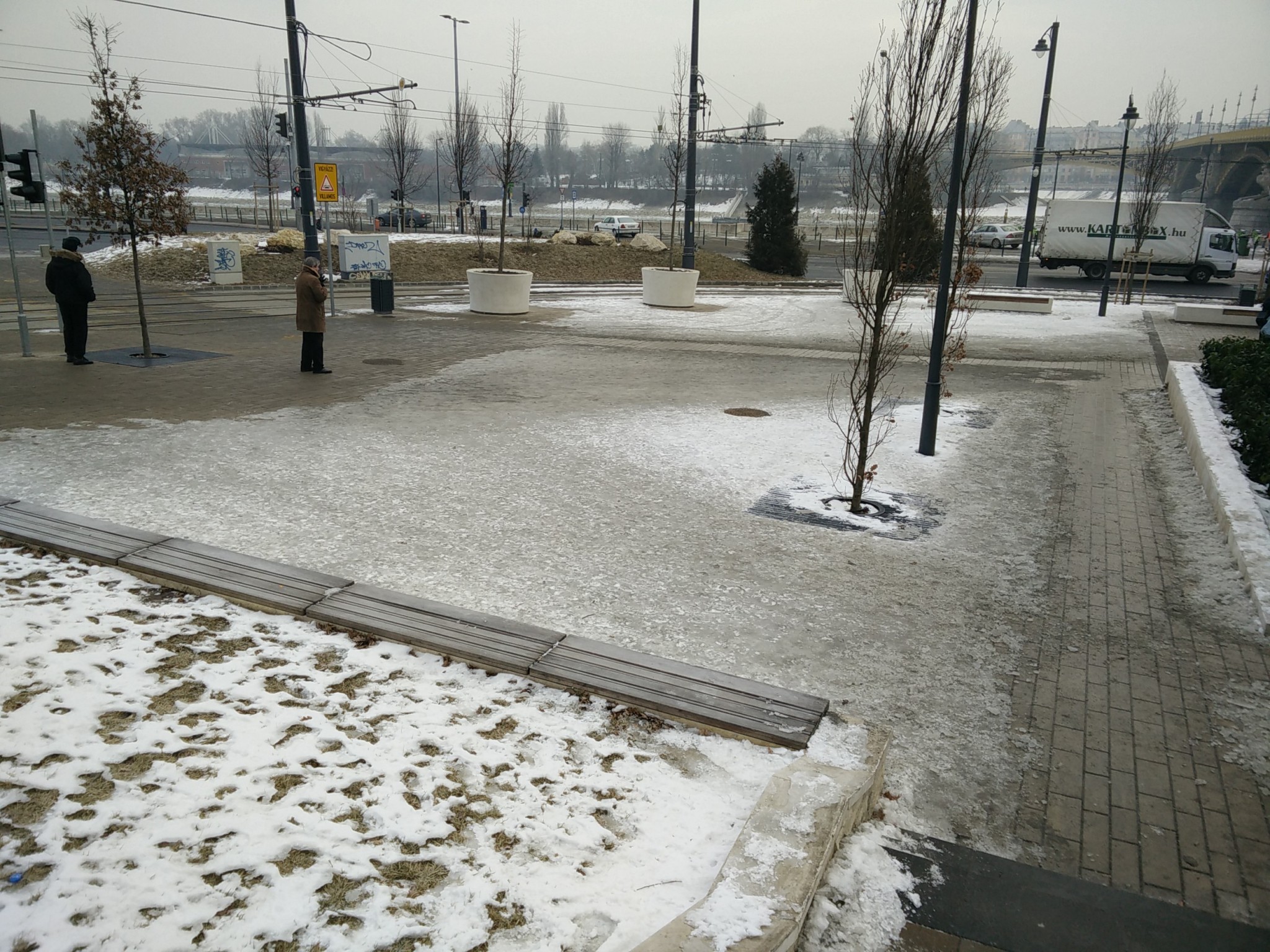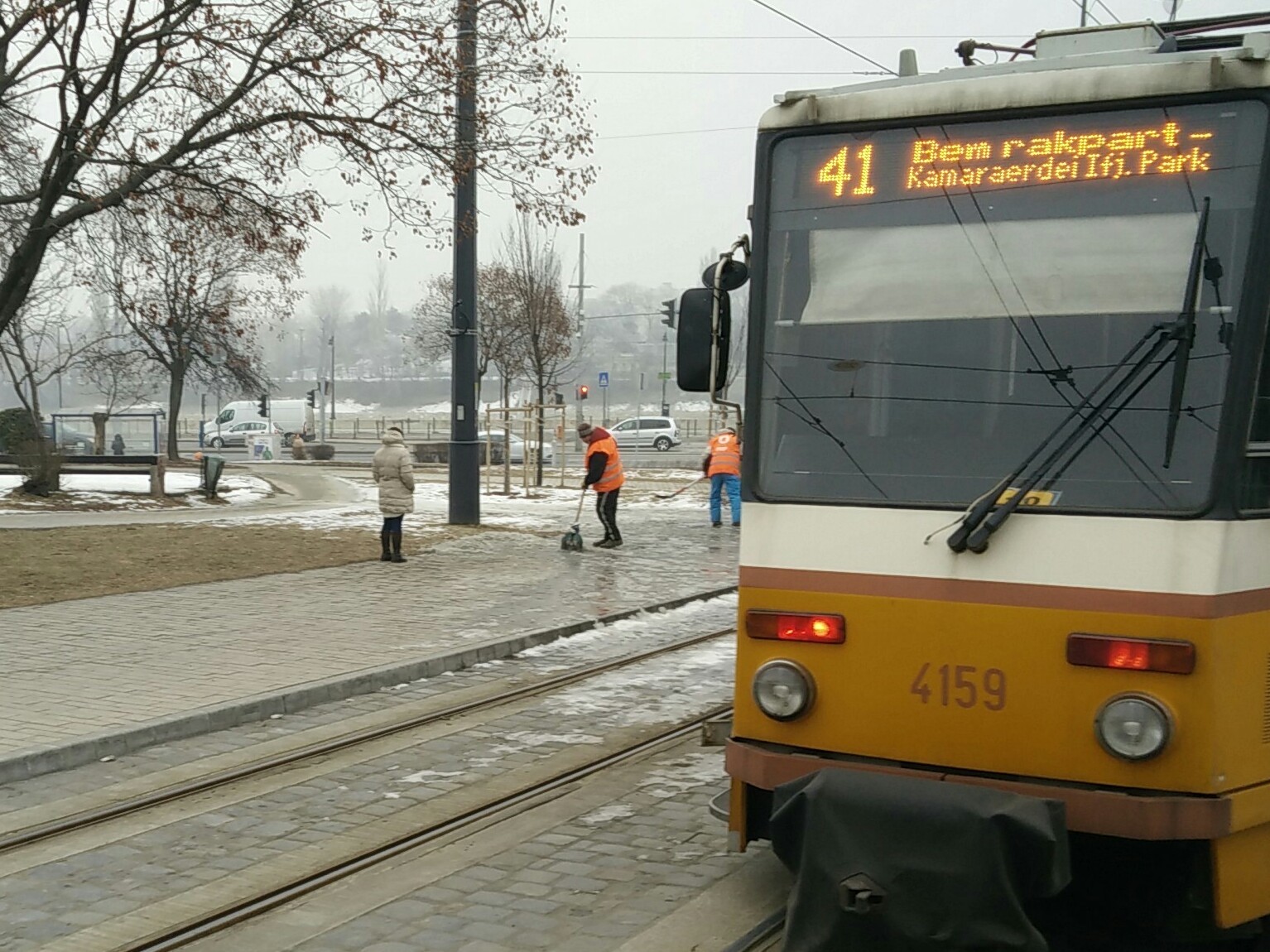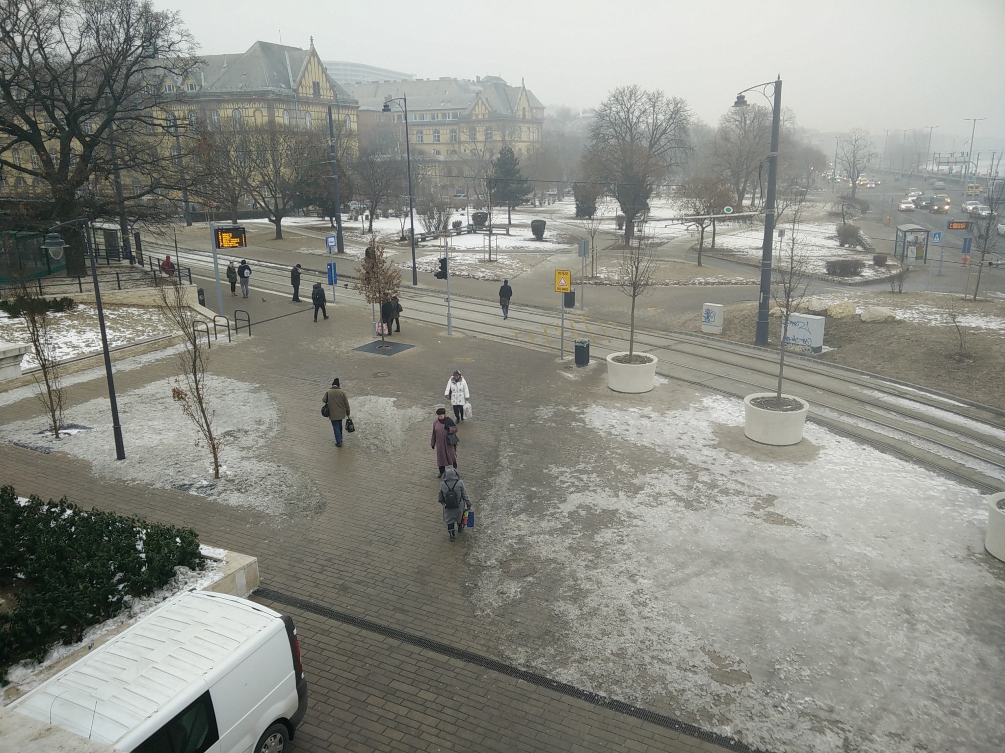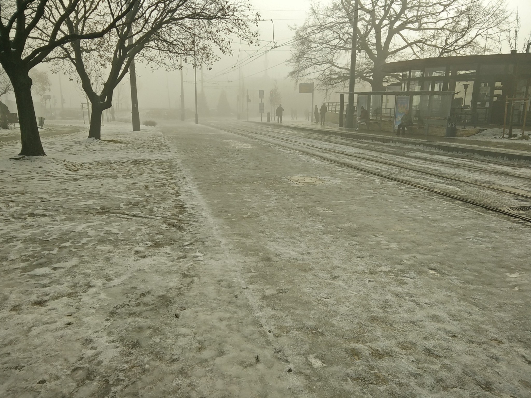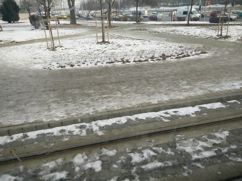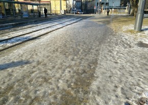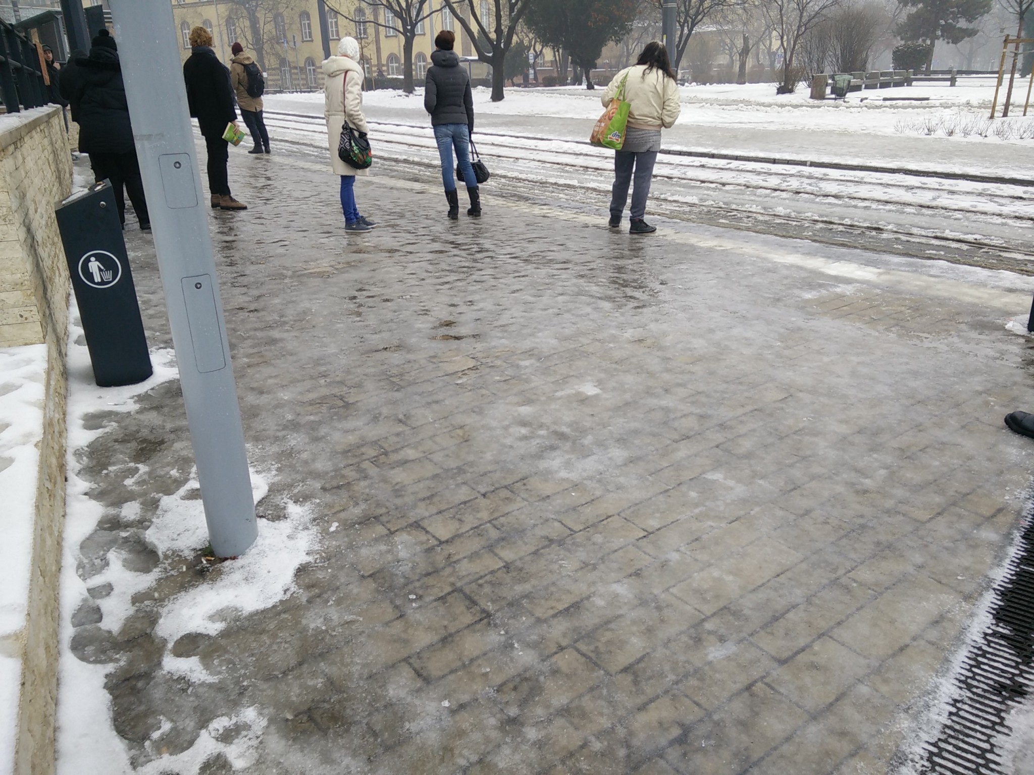 A Budapest Margit hid budai hidfonel talahato 19-es villamosmegallonal a jarda tobb helyen nincs megfeleloen takaritva, ezert jeges, csuszos.