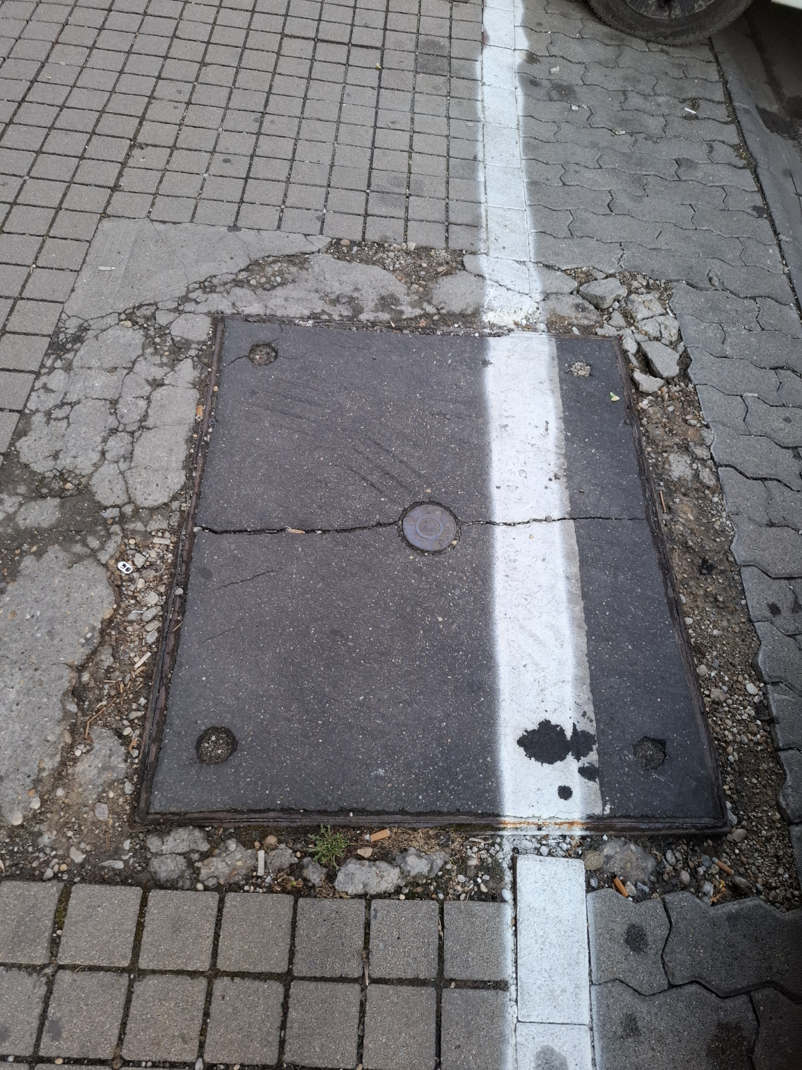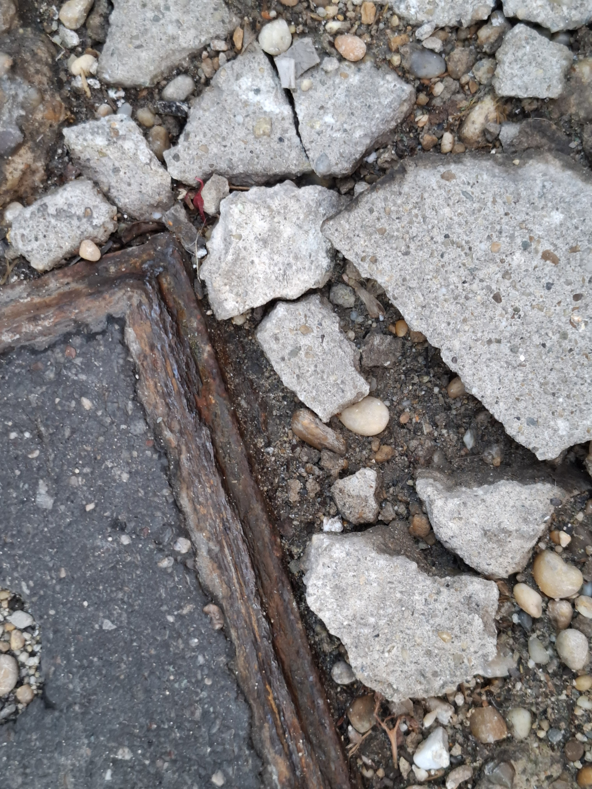 A Radnóti Miklós u. 5-7 előtt az aknafedelet tartó betonelem teljesen szètporladt. A fedlap fèm szerkezete is teljesen szètrozsdásodott.