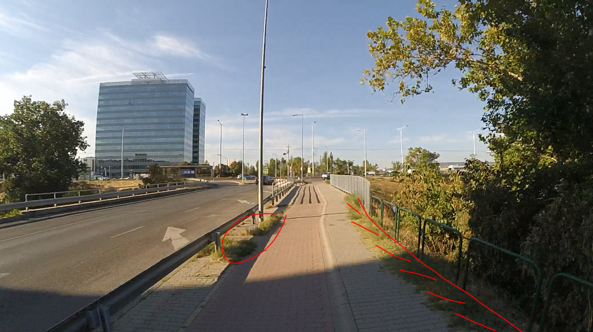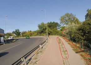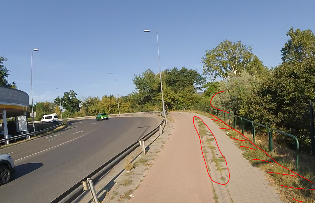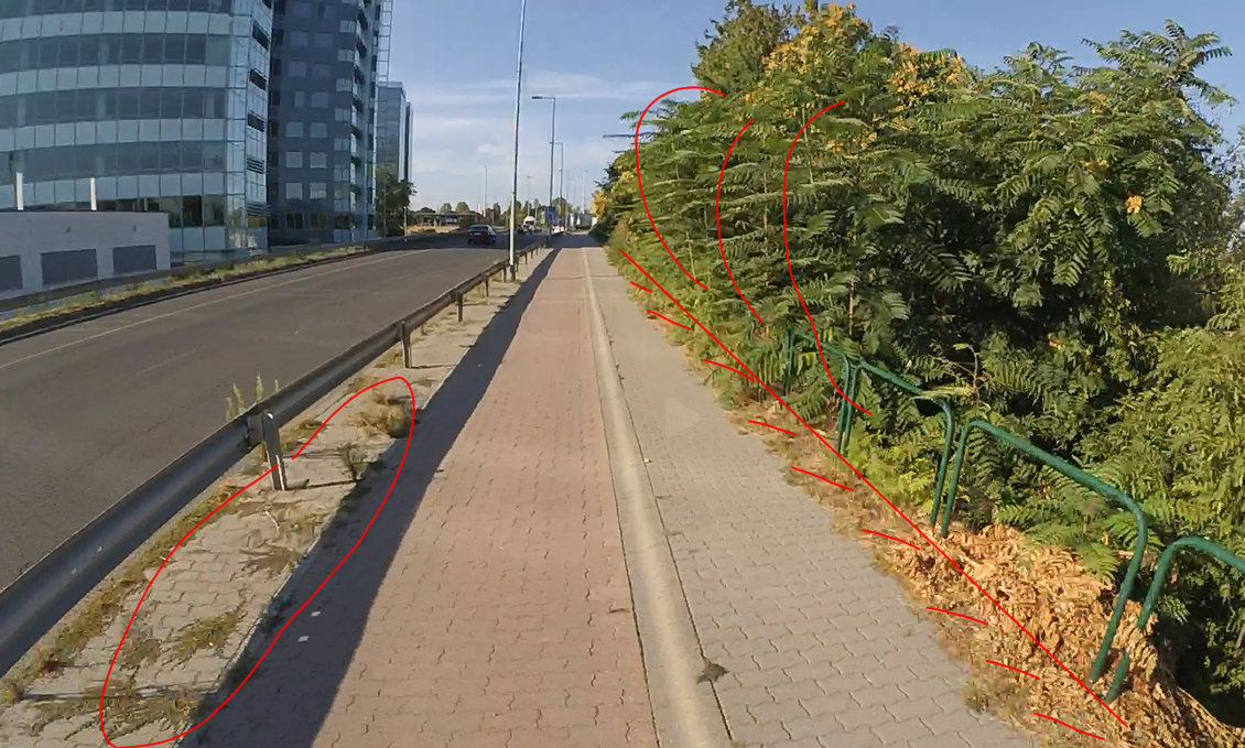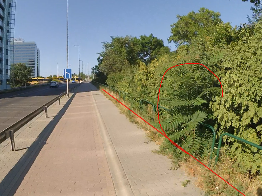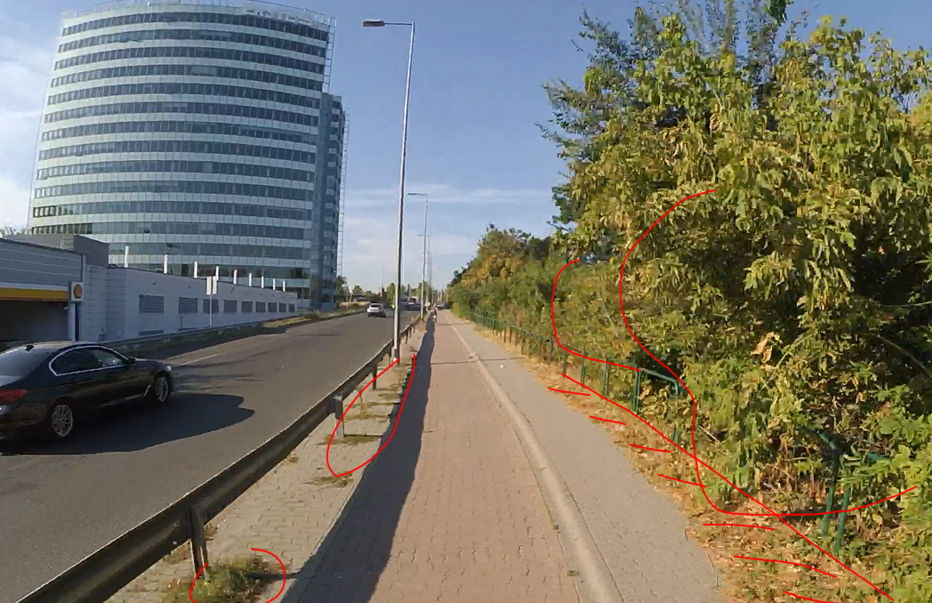 A járdára lógó ágak és gaz több helyen elérték a kerékpárutat, ezzel a járda teljes szélességében használhatatlanná vált.