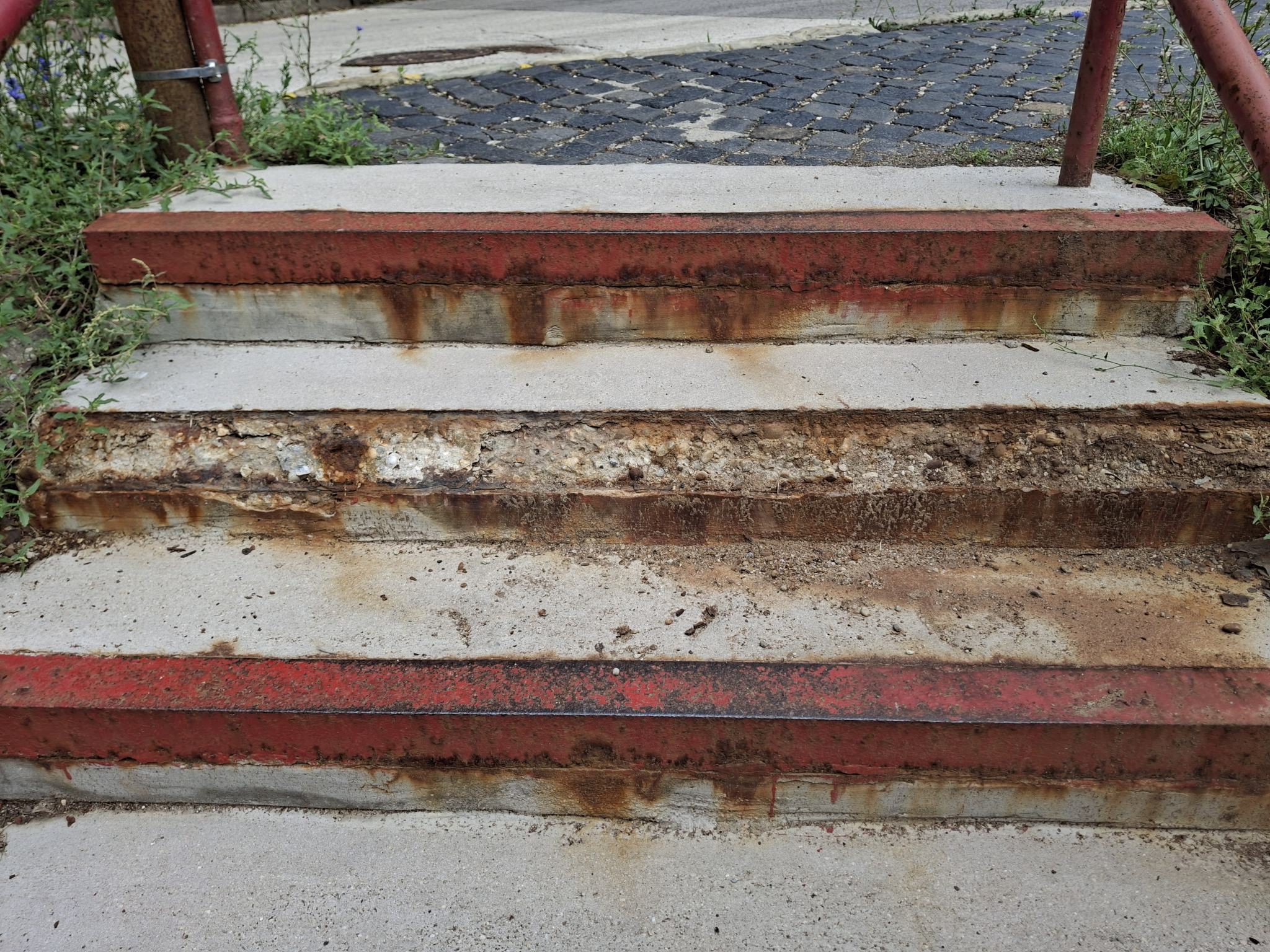 Az egyik lépcsőfok szèle teljes szélességében letört. Nagyon balesetveszélyes a helyzet, ami hetek óta fennáll.