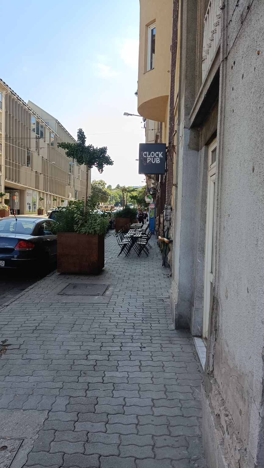 A járda EGÉSZ felülete a Clock pub asztalai, székei által el van foglalva. A járdaszakasz, teljes mértékben használhatatlan.