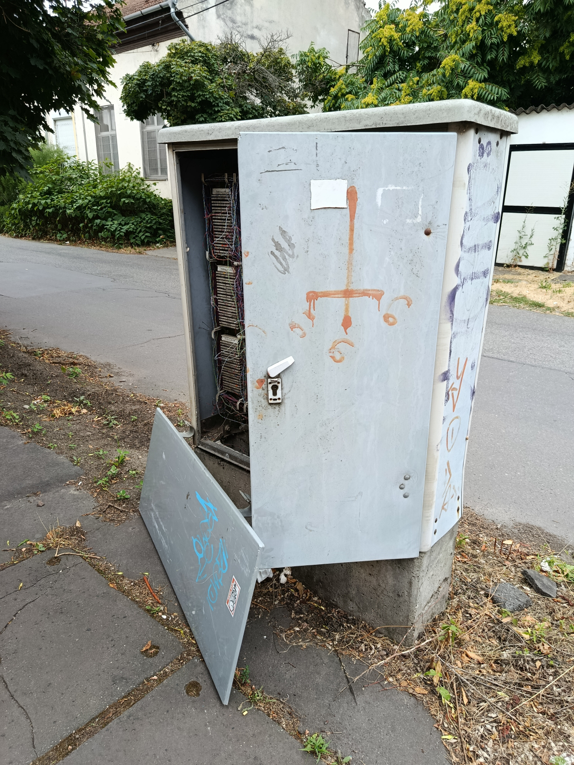 1191 Vak Bottyán utca és Nyáry Pál sarkán van a kapcsolószekrény. Valaki feltörte, az egyik ajtaját leszakította. Azt nem tudom, hogy elektromos vagy telekom.