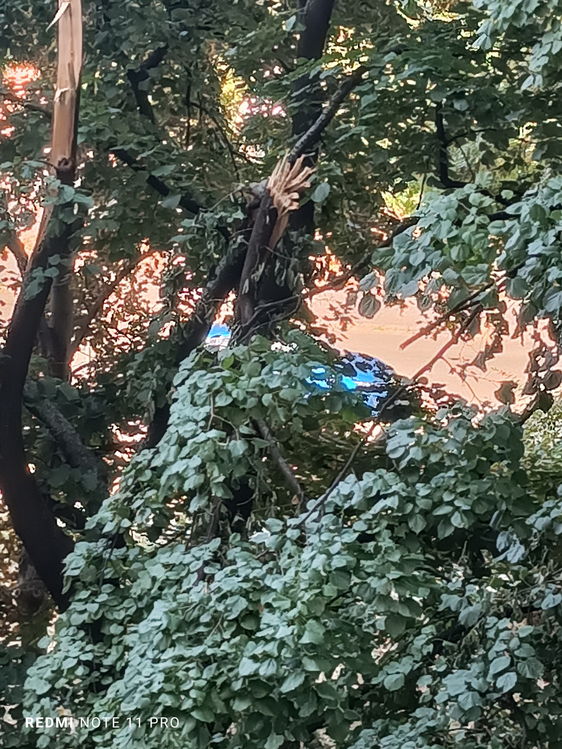 A 3. kerület Folyamőr és Búvár utca közötti parkban (Folyamőr u. 2-nél) egy nagy hársfát megtépázott a múlt heti vihar. Egy ág teljesen leszakadt, az már a földön van, a takarítás ráérne míg az ezzel kapcsolatos dolgokat intézi, de e tegnap este a szelesebb időben tűnt fel, hogy egy másik ág is letörött viszont az csak lóg, a tegnap eseti szél óta folyamatosan recseg is, bármikor leszakadhat végleg. A parkban gyerekek, járókelők és kutyák is szoktak pihenni sétálni.