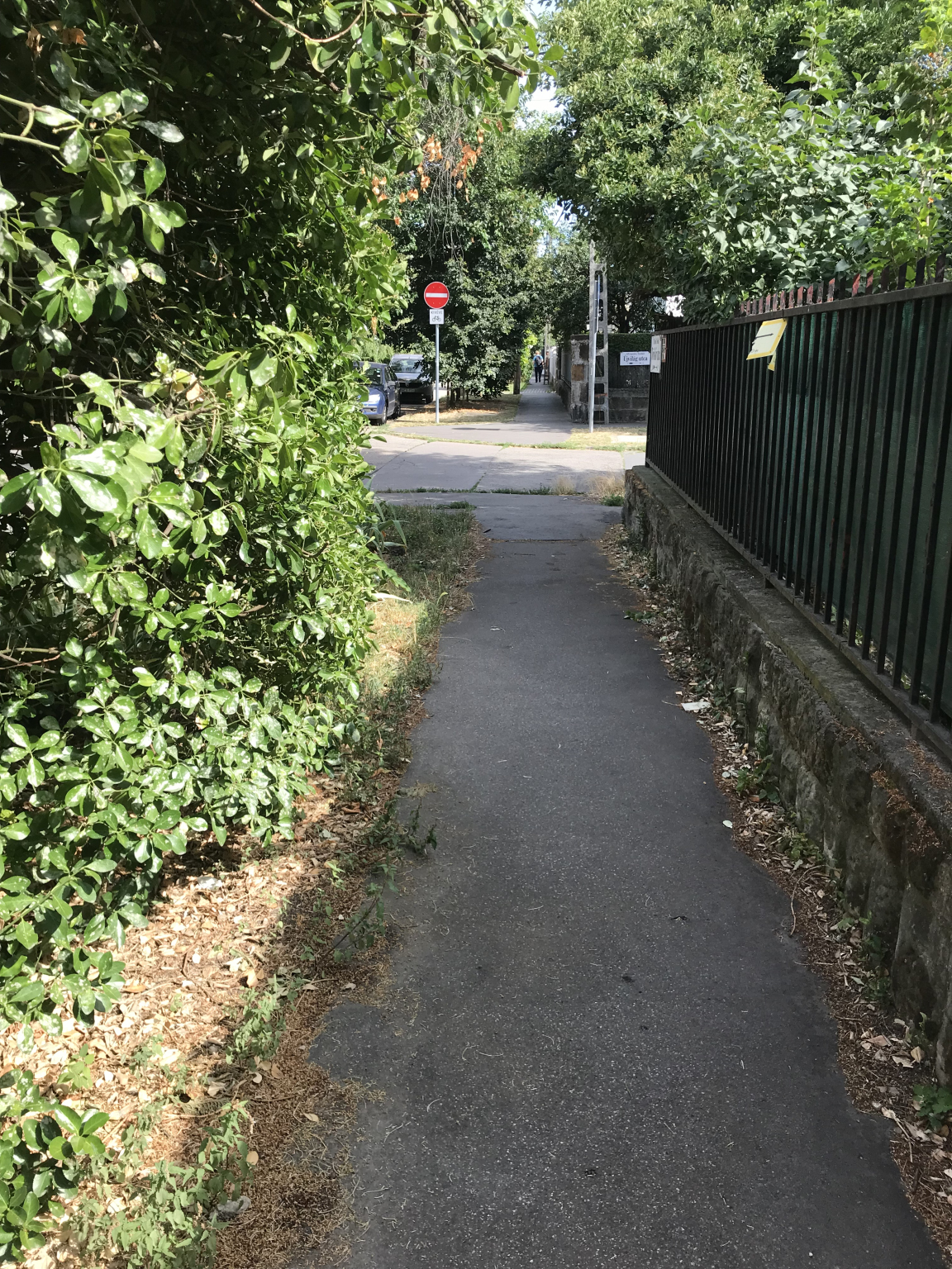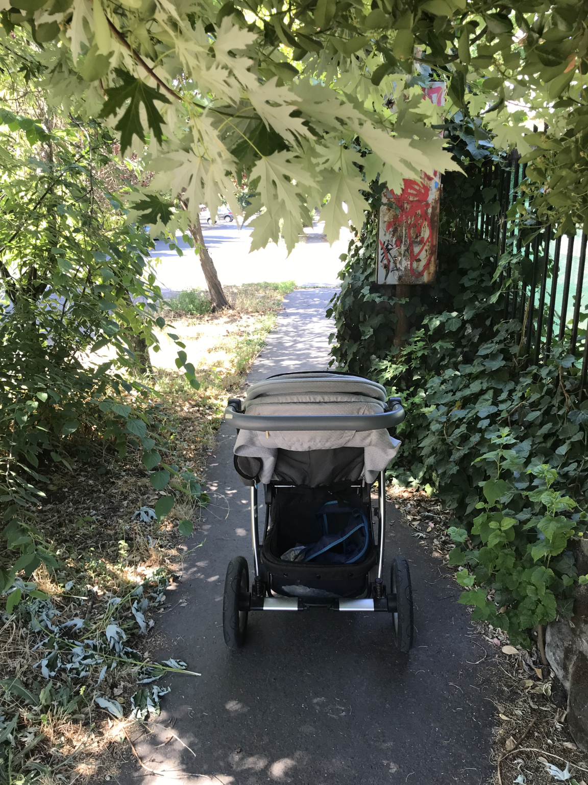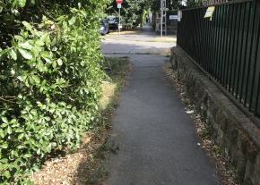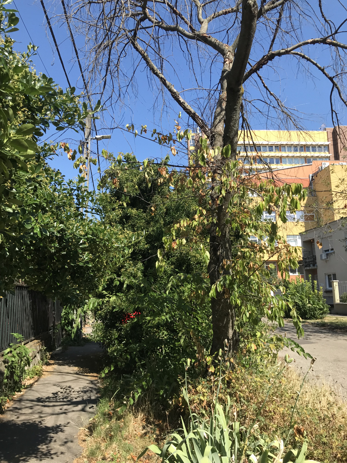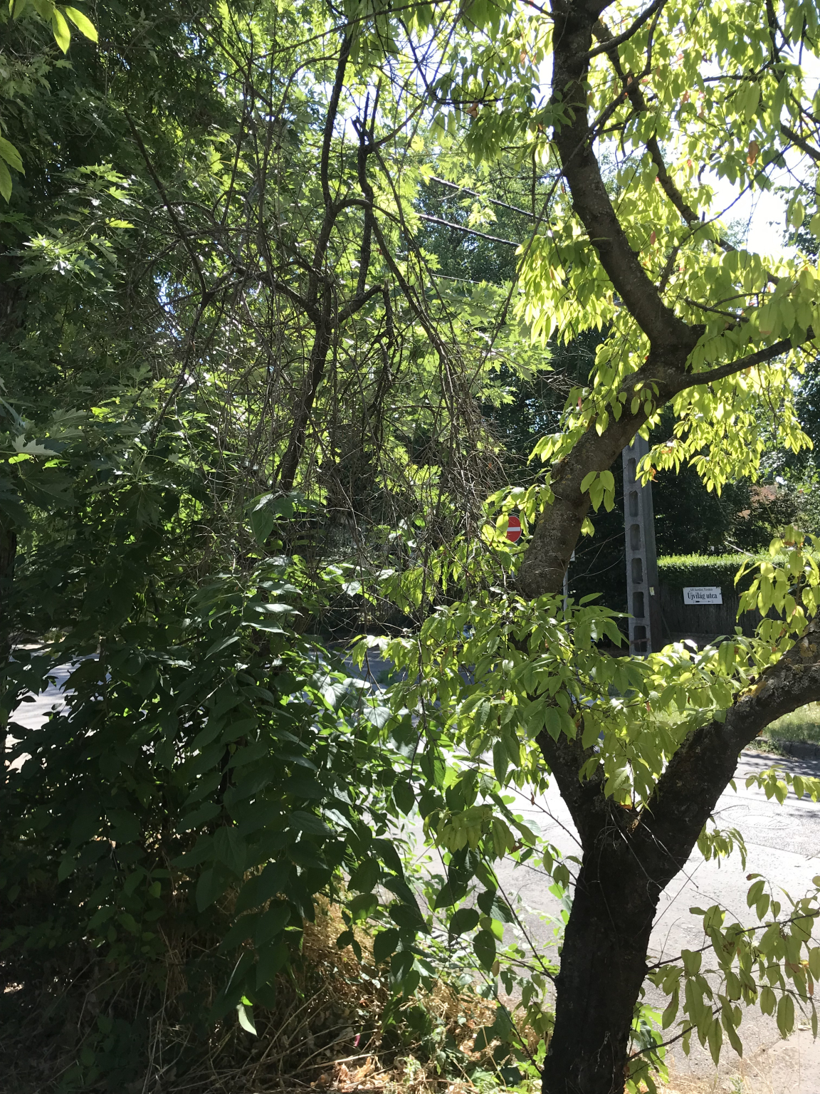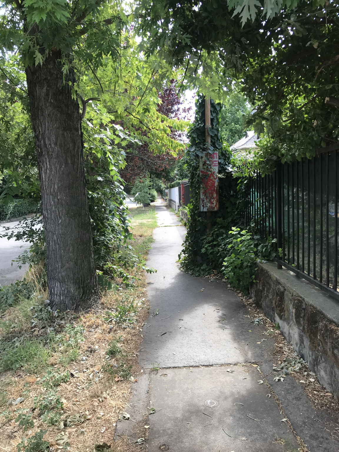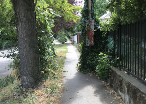 Zuglóban az Újvilág utca és Törökőr utca sarkánál alig lehet elmenni a járdán a faágak miatt. Babakocsival is alig férünk el a járdán a sok belógó ágtól.