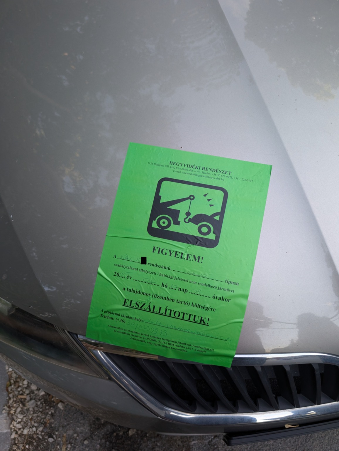 Azt tapasztaltam, hogy a Szendrő utca 18. szám magasságában ma reggel (2025.07.17-én) egy autót elszállított a Hegyvidéki Rendészet, viszont az erről szóló értesítést a legközelebbi parkoló autó motorháztetejére ragasztották.