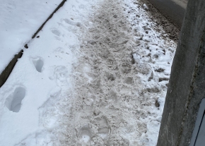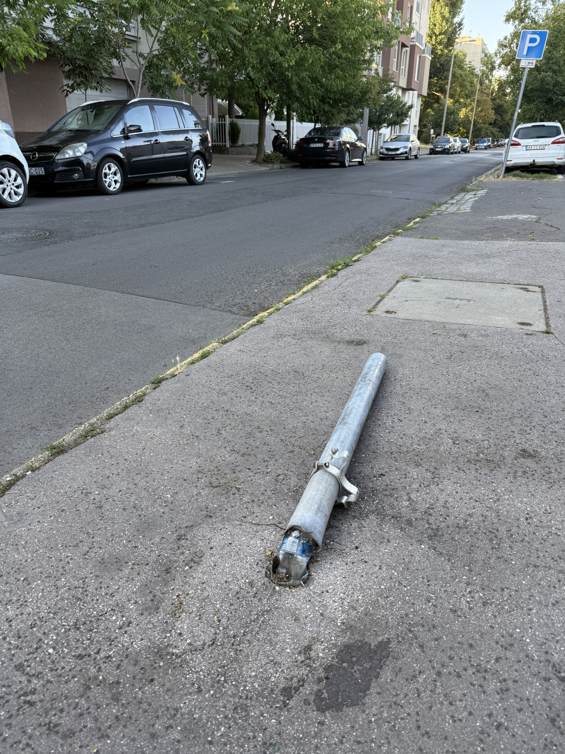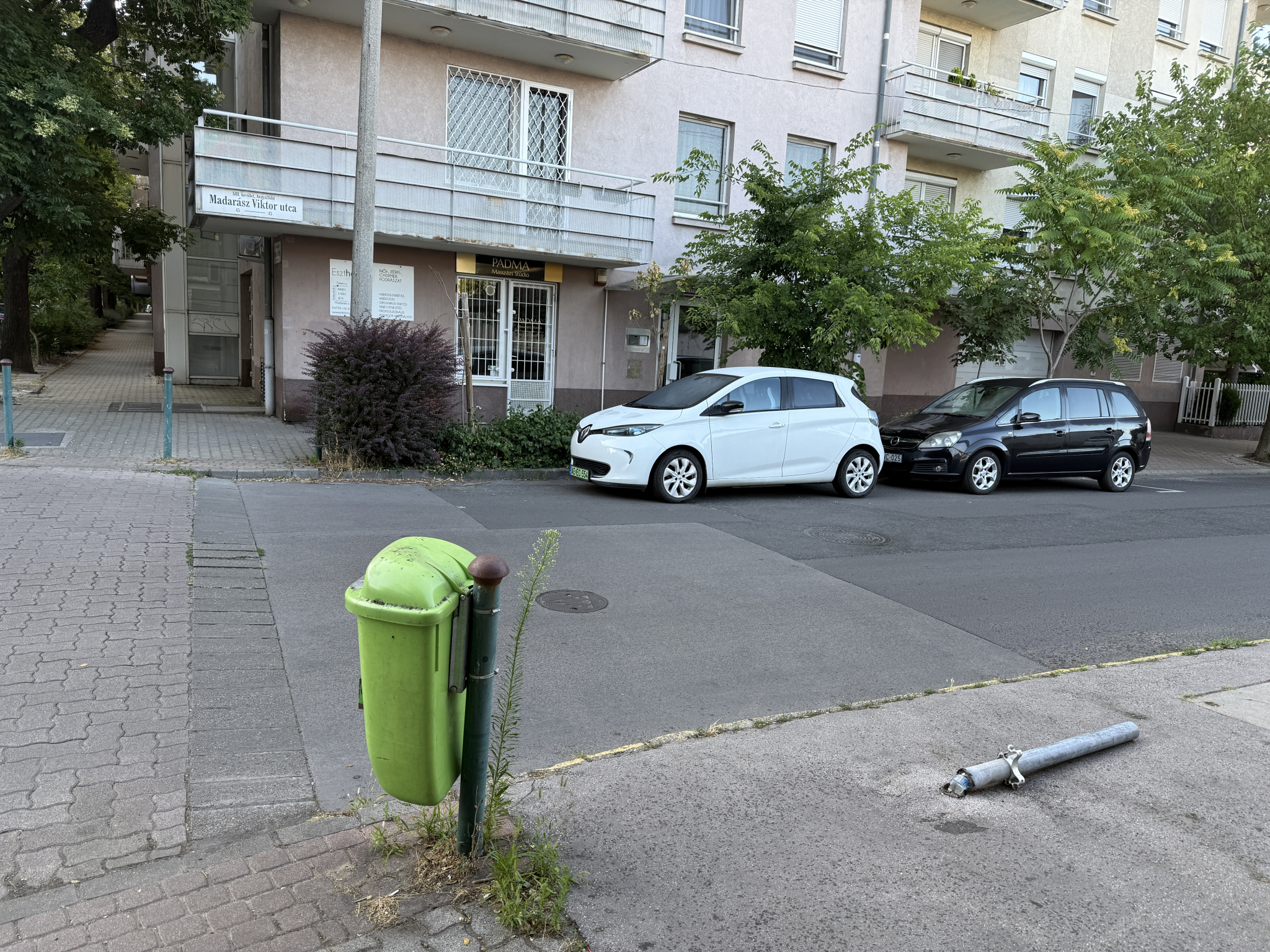 Az oszlopot kirúgták, a kuka emiatt a parkolásgátlóra került áthelyezésre. De nem is ez a fő probléma, hanem hogy a régi oszlopot nem szállítátták el és az aszfaltban ott maradt a sorjás fém, ami balesetveszélyes.