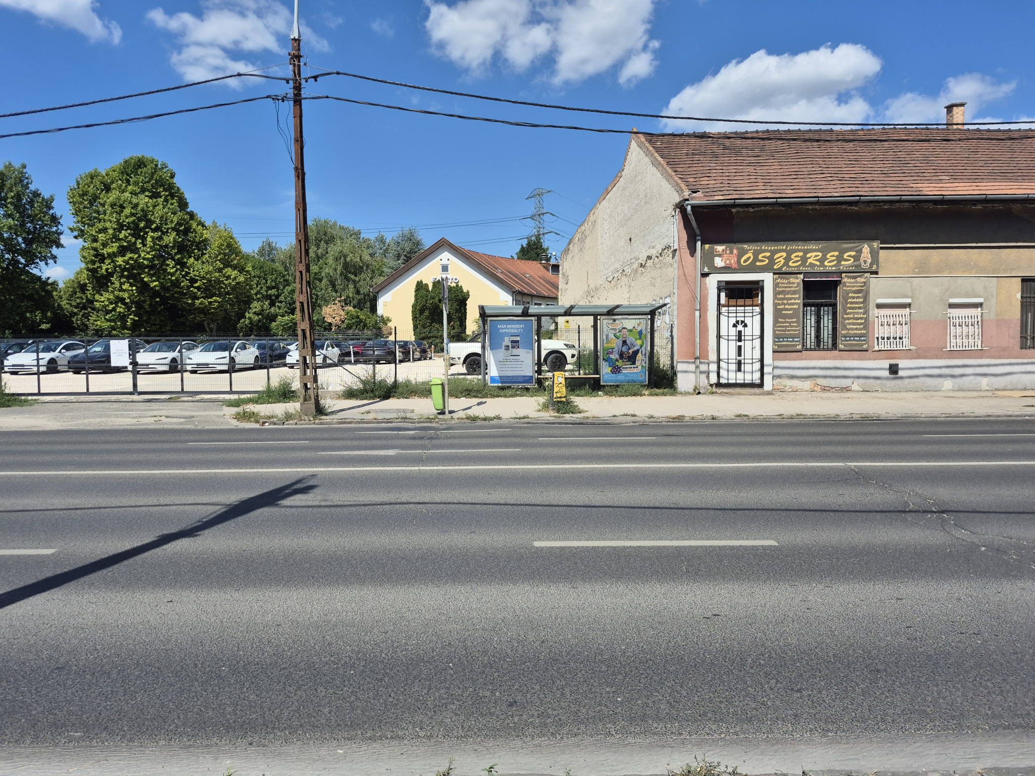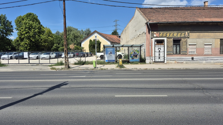 A buszmegálló közepén graffitis és gazos a sárga valami. Talán Főgáz?