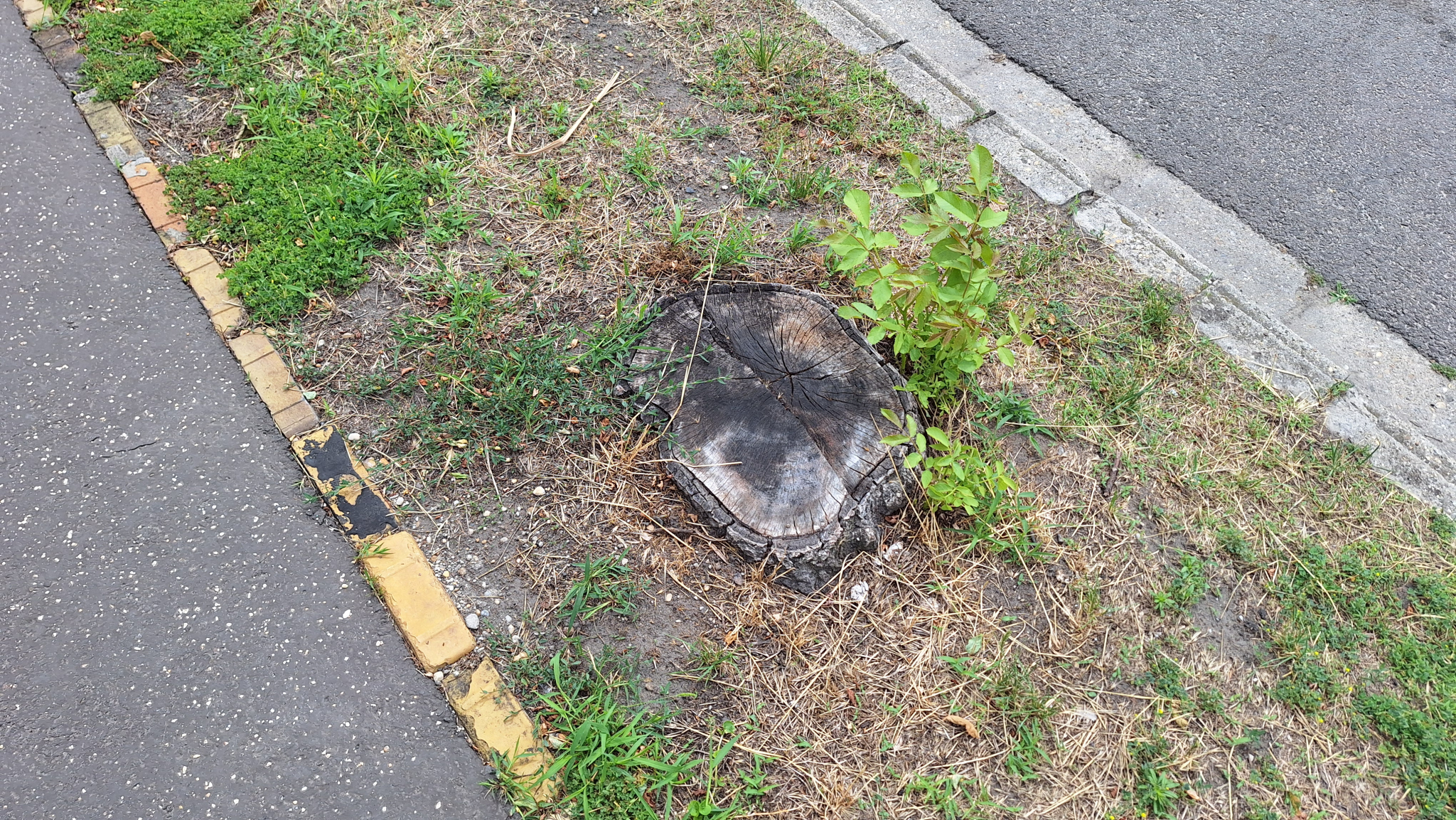 A Felvidék utca 3. előtt van egy régi fatuskó.