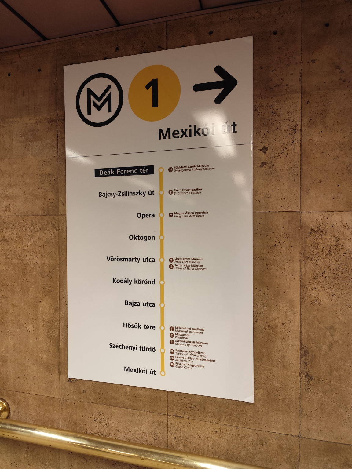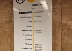 A Deák Ferenc téren az M1-es metróhoz vezető lépcsőknél lévő egyik tájékoztató táblán néhány megálló neve kopott, nehezen olvasható. Sajnos a legkevésbé látható pont a turisták számára fontos Hősök tere.