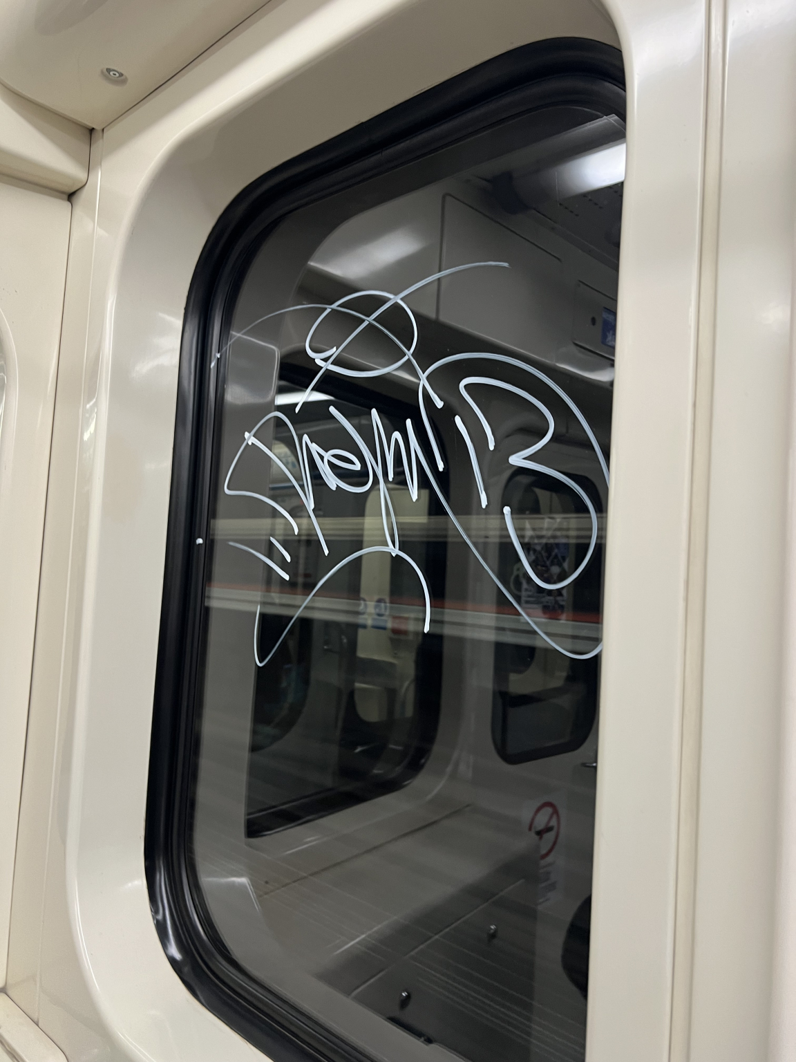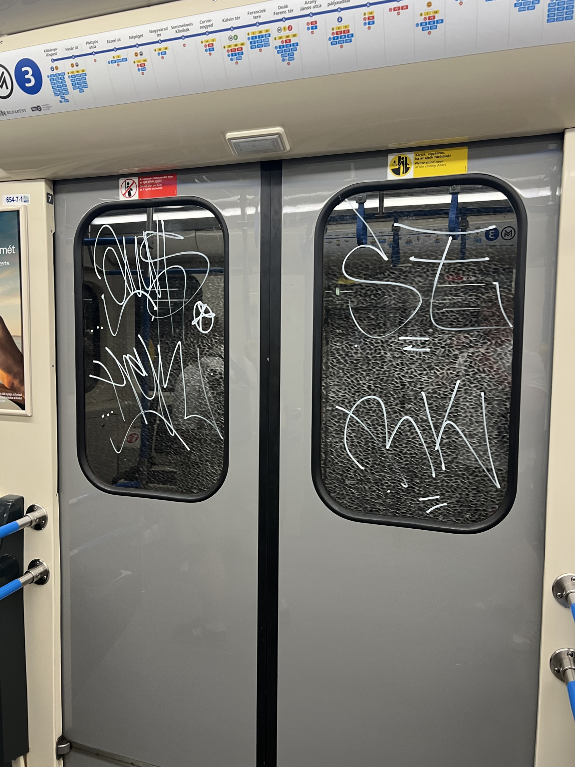 Szeretném jelezni, hogy az M3-as metróvonalon közlekedő, 654-es pályaszámú kocsi egyik ajtajának üvegfelülete, valamint az egyik ablaka graffitivel van összefirkálva. Kérem, hogy a szennyezett felületek mielőbbi megtisztításáról gondoskodjanak az utazóközönség kulturált környezetének biztosítása érdekében.