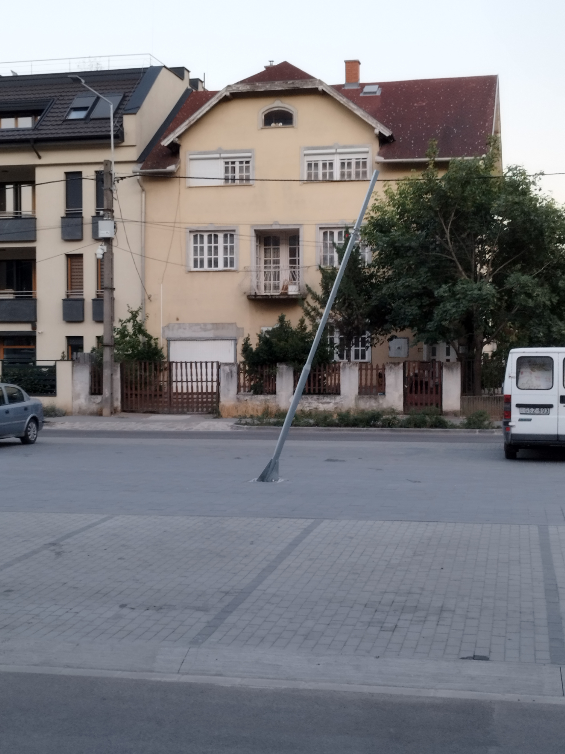 Valószínűleg parkolás közben nekimentek az oszlopnak, ami megdőlt és úgy maradt.