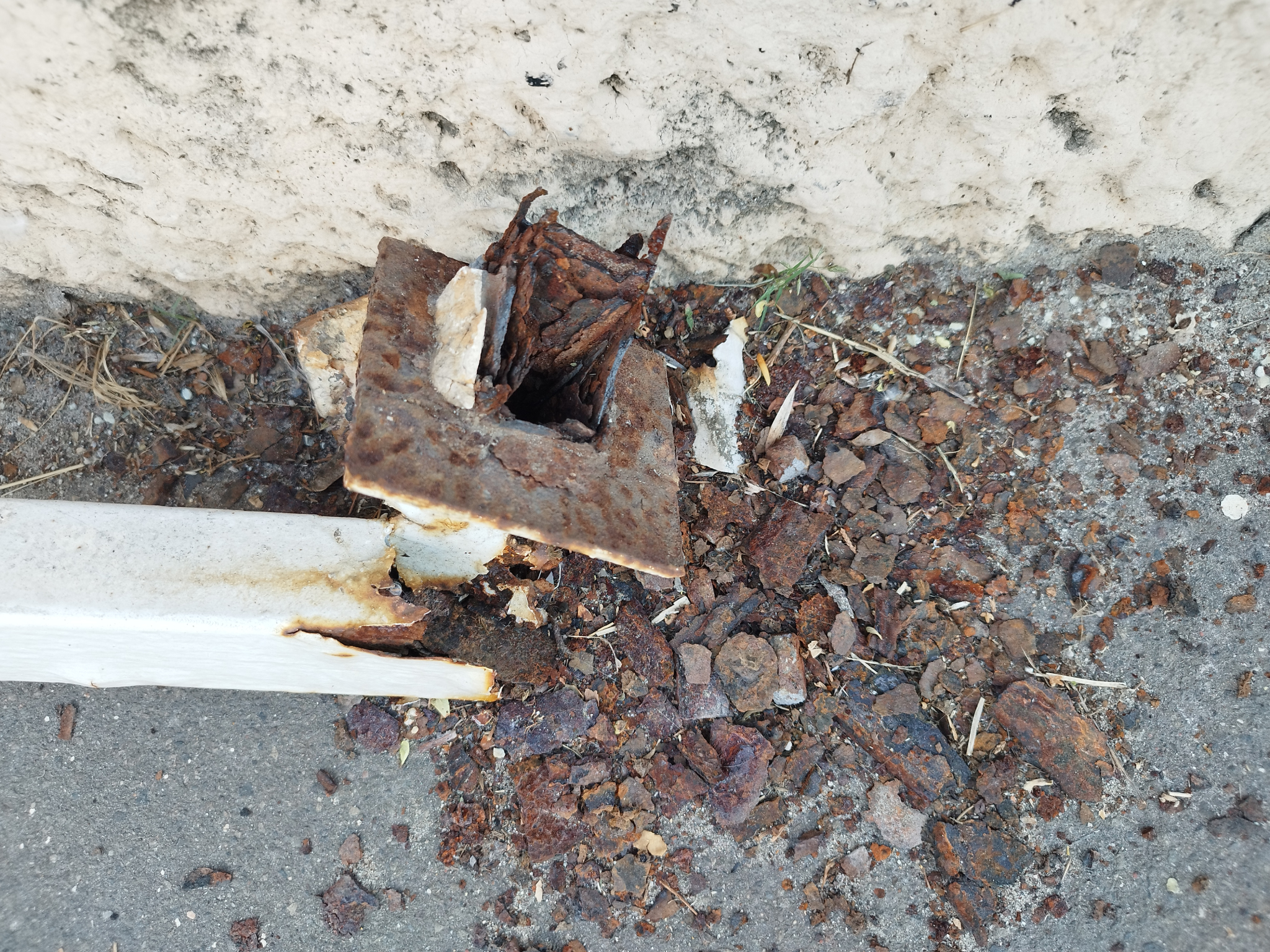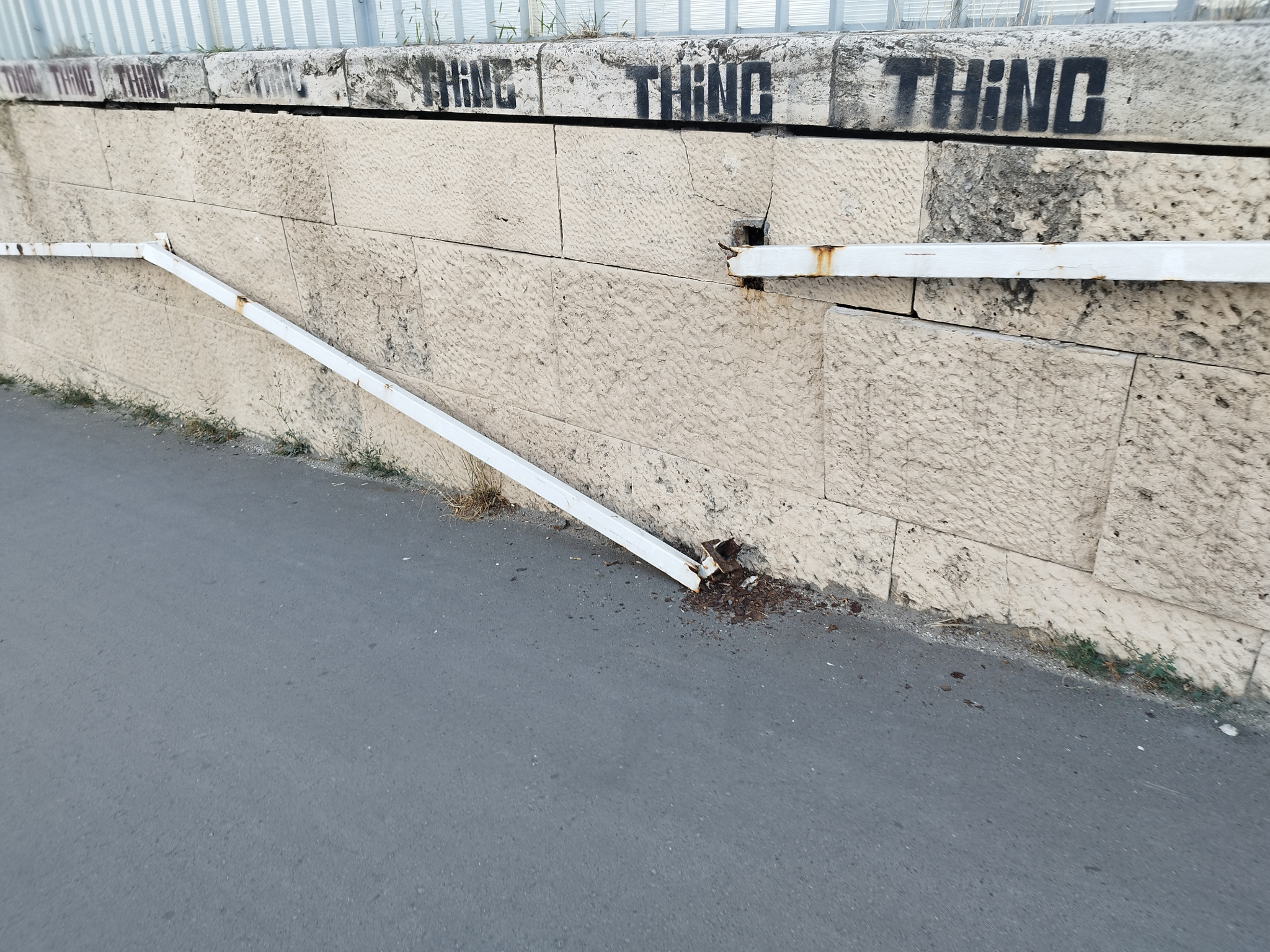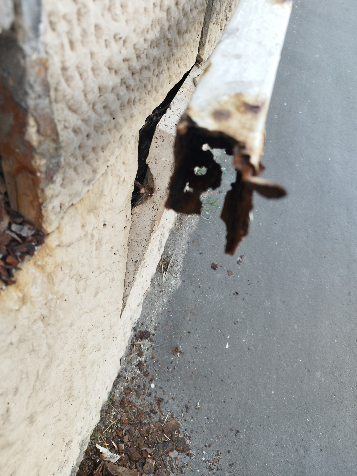 Korlát leszakadva, falburkolat kiomlóban