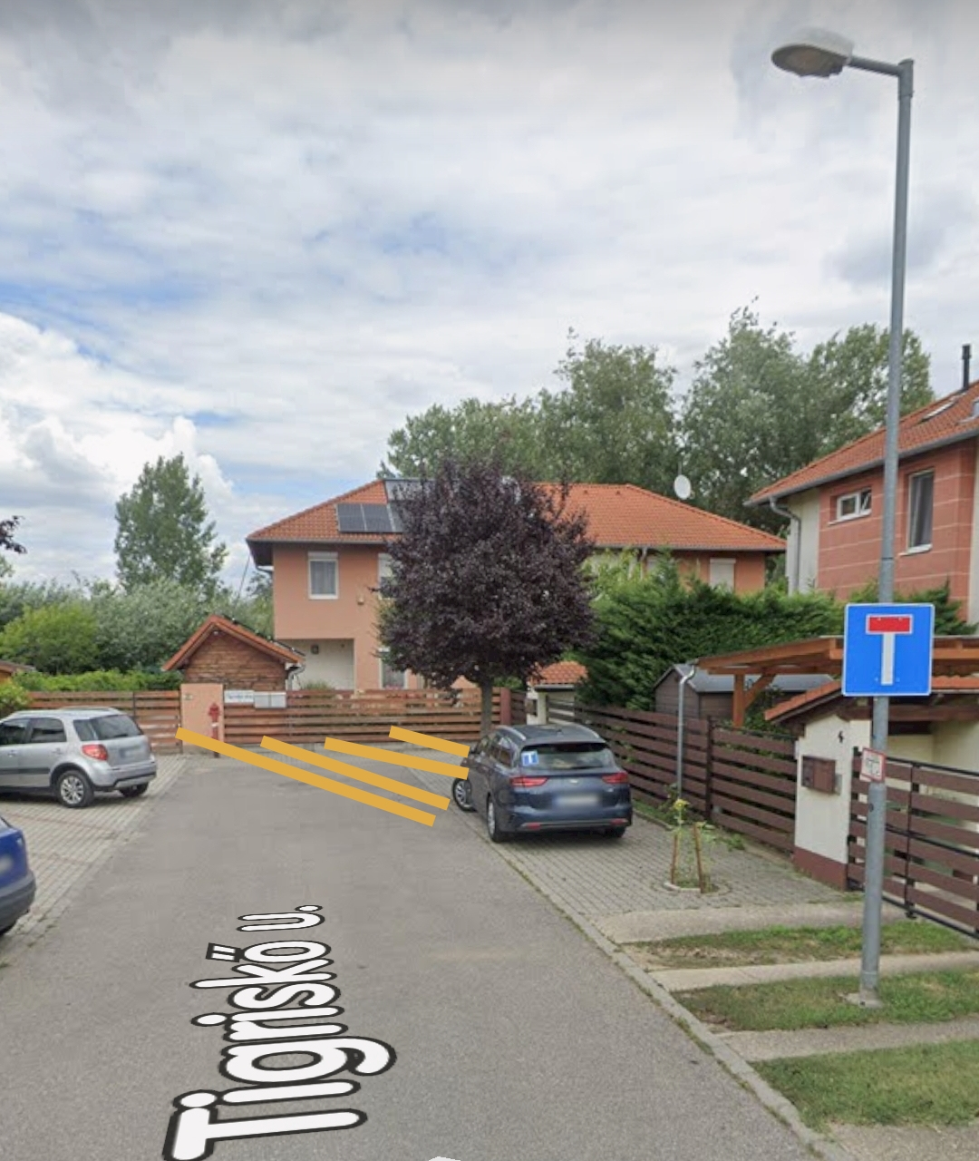A következő észrevételeim lennének: A Tigriskő 2 szám előtt kérném megvizsgálni, hogy elegendő-e a jelenlegi közvilágítás. A zsákutca ezen szakaszán nem található villanyoszlop. (A képen sárga vonallal jelzett terület nagyon sötét)