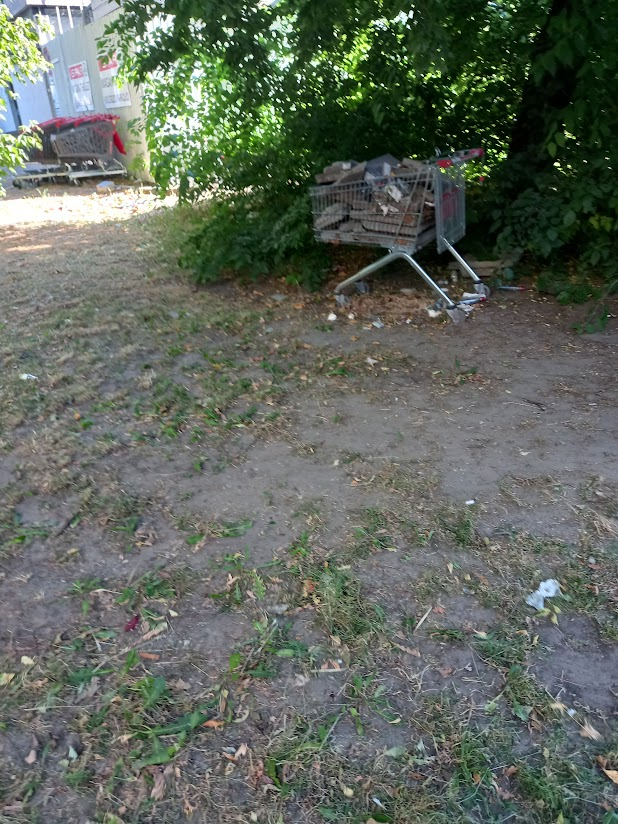 Budapest, 1144 Szentmihályi út 23. számú Spár mögötti parkban már évek óta áll egy bevásárlókocsi telerakva építési törmelékkel (járdalapokkal). Kérjük az elszállítását.