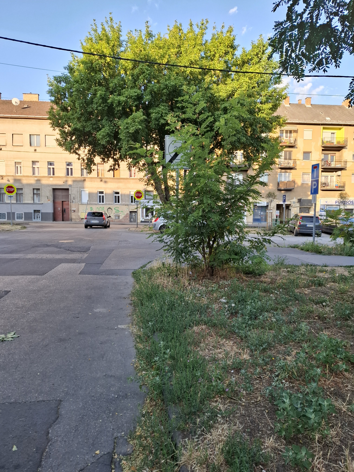 Az elburjánzott növényzettől nem látható jól a közlekedési tábla és a kereszteződés is beláthatatlan.