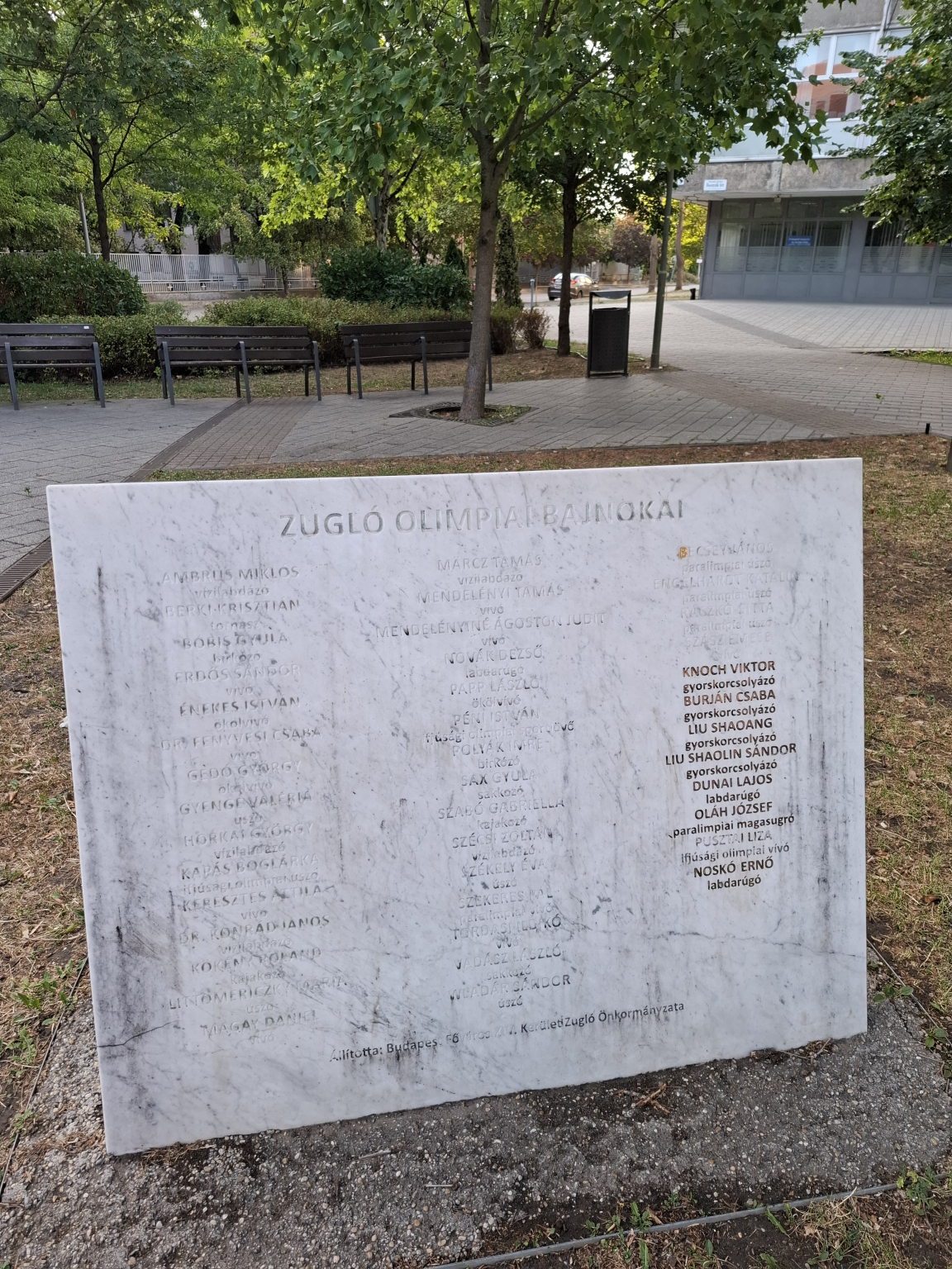 A Bosnyák téren a Zugló olimpiai bajnokai emléktábla elég elhanyagolt. A régebbi bajnokok nevét alig lehet kiolvasni, míg az újak olvashatóak. Furcsa egy kontraszt. Szerintem minden bajnok megérdemelné, hogy a neve olvasható legyen. Mellesleg az egyik bajnok nevének kezdőbetűjét valaki arany színnel kiemelte, ami teljesen elüt a tábla színétől.