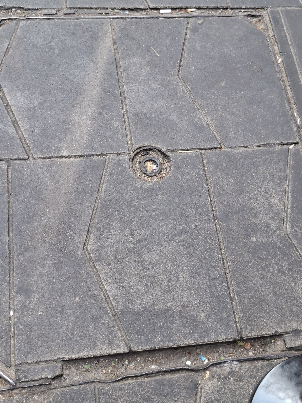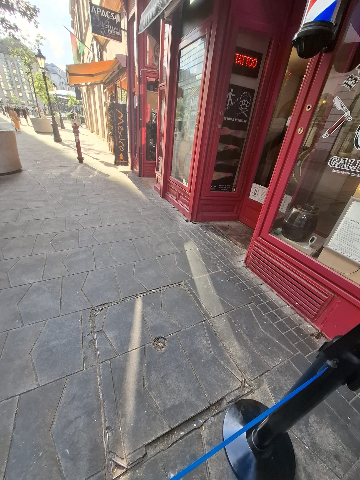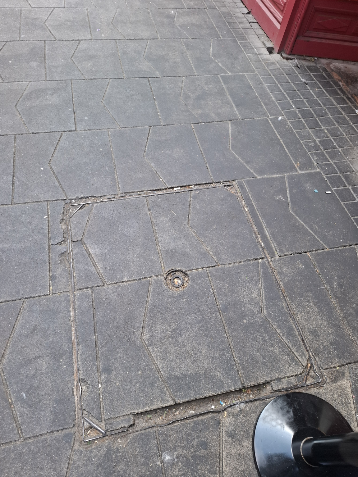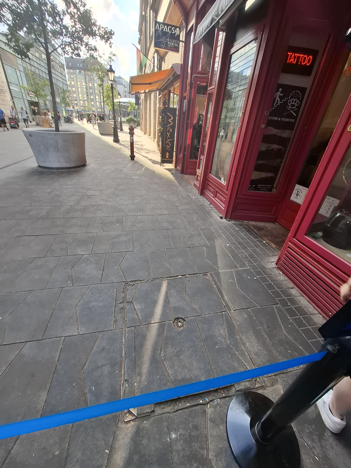 A fedlap közepe kitört, a széléből hiányoznak az oda méretezett térkövek.