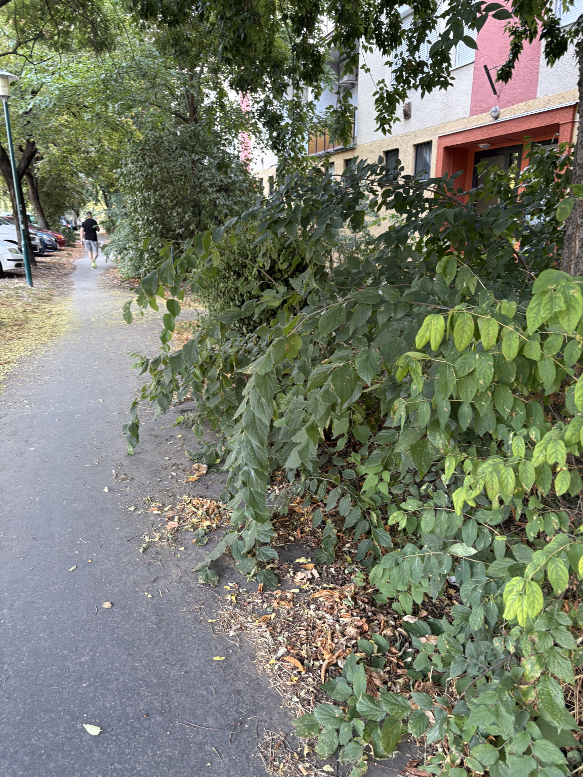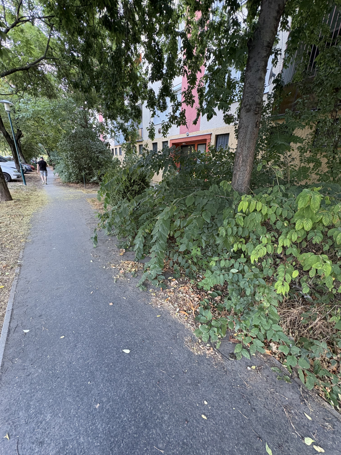 Az Egressy út páros oldalán, a Róna utca és a Baeoczy utca között több helyen a növényzet akadályozza a gyalogos közlekedést.