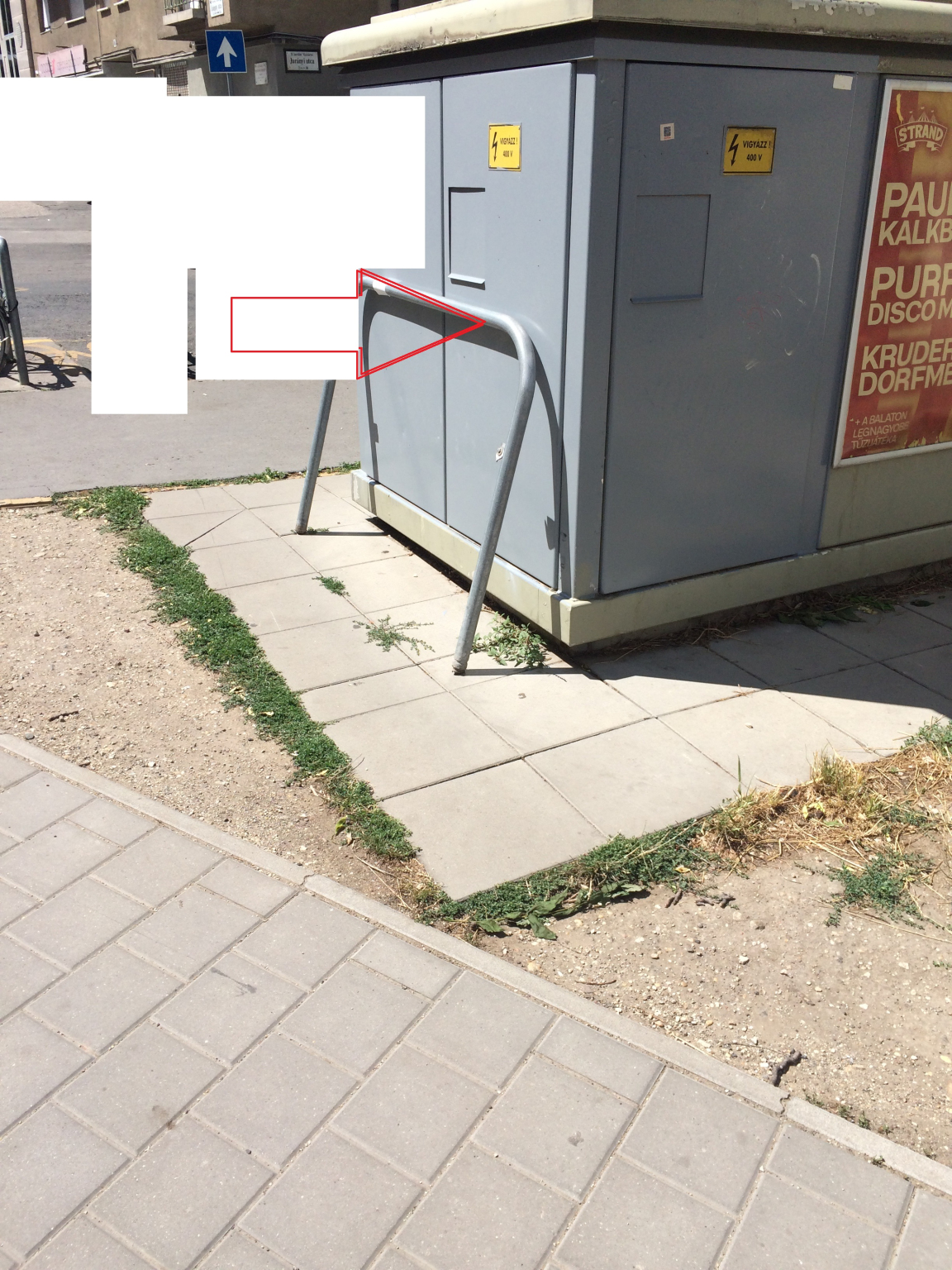 Jelzett helyszínen lévő biciklitároló csőkorlátja kidőlt, a villamos elosztónak van támasztva.