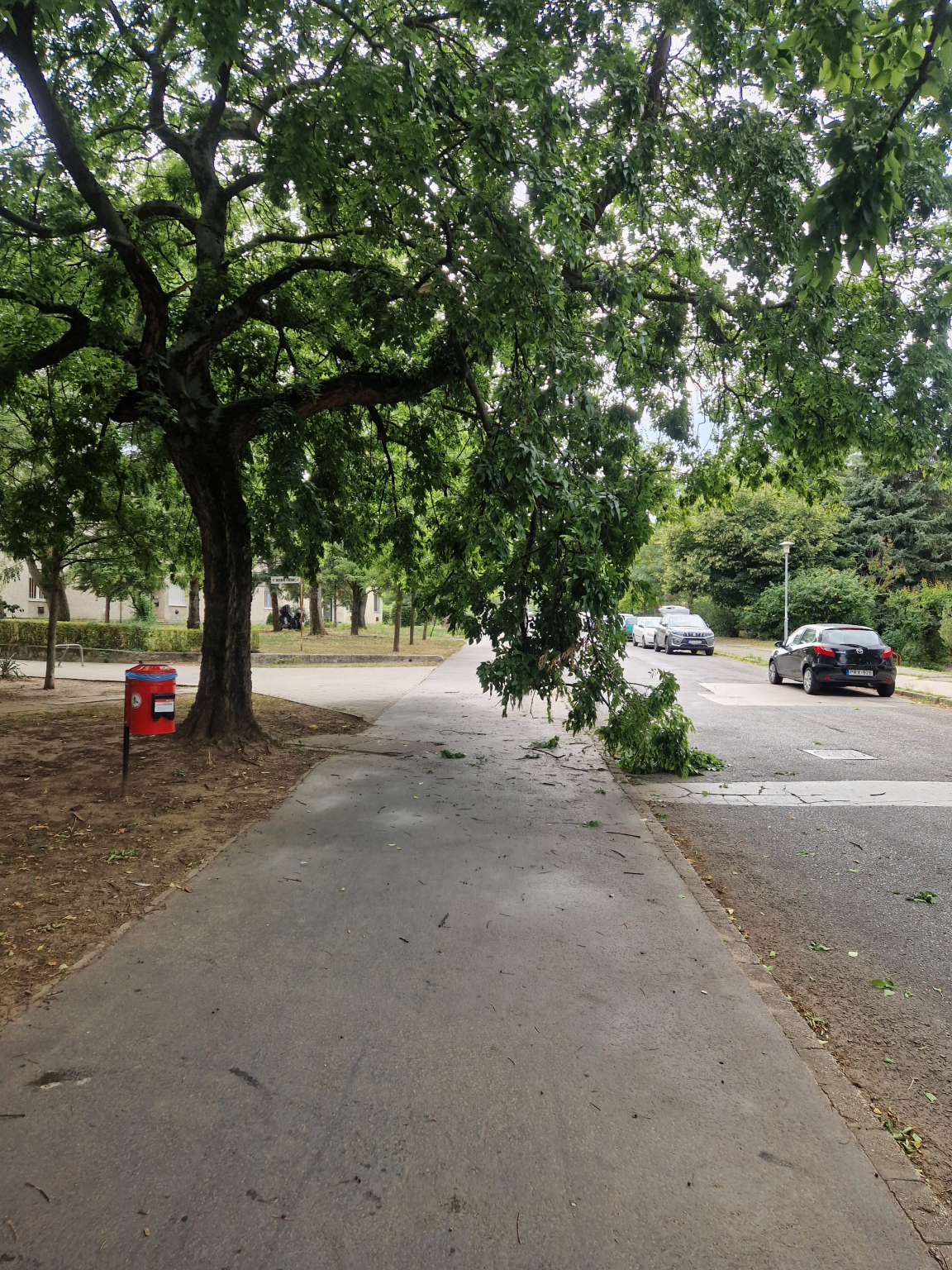 A Sasvár utcában, ha jól tudom, a 105-ös szám előtt az úttestre és a járdára lóg egy letört faág.Nem annyira biztonságos az úgy ott.