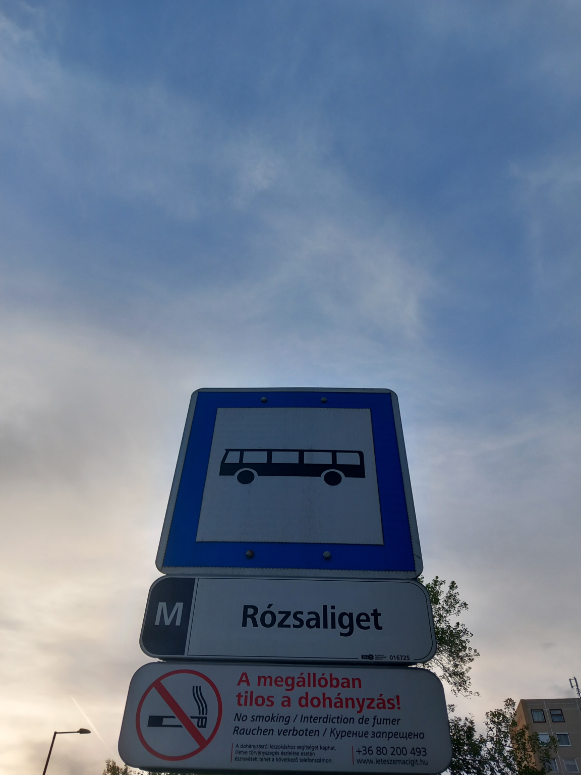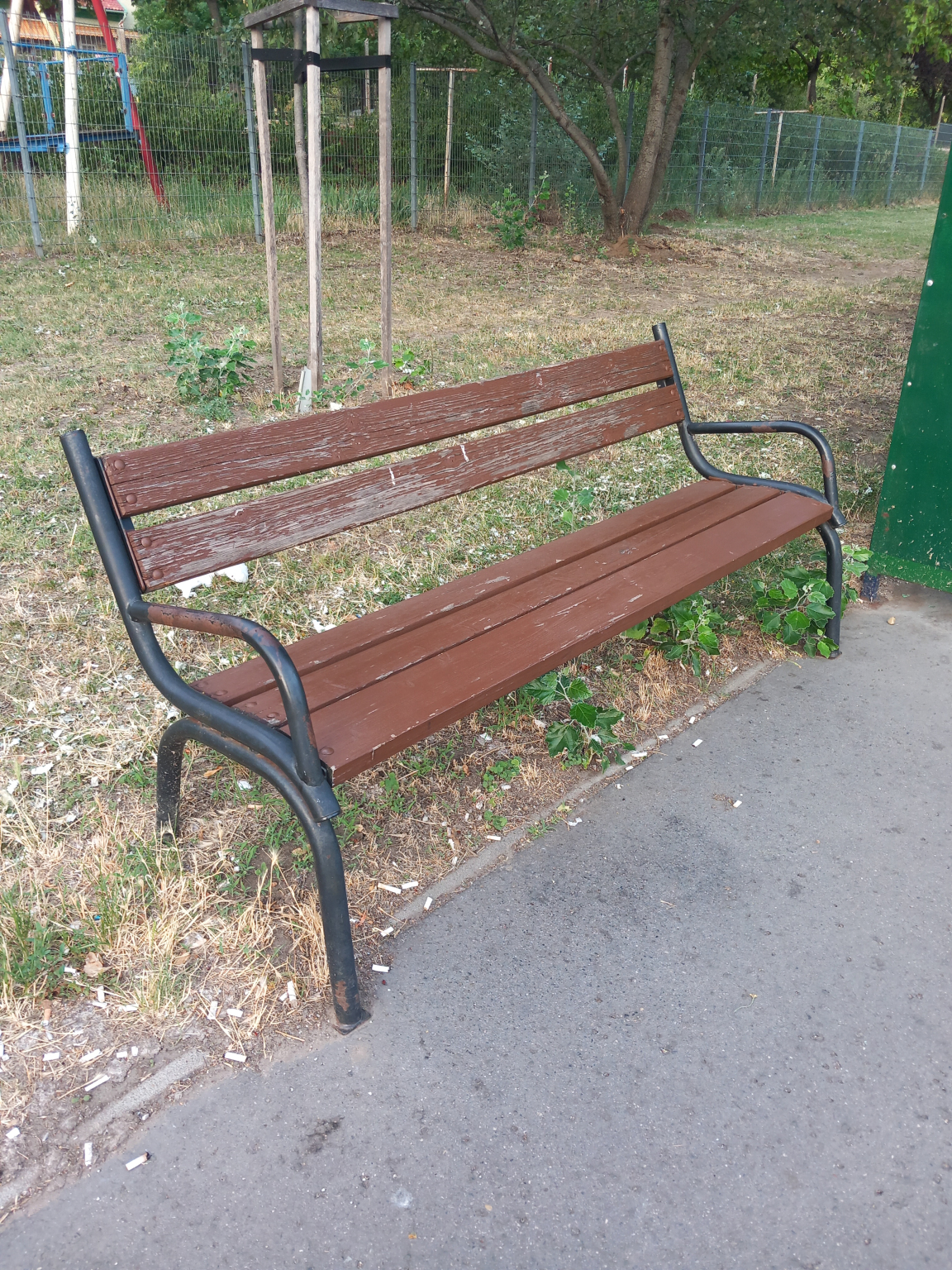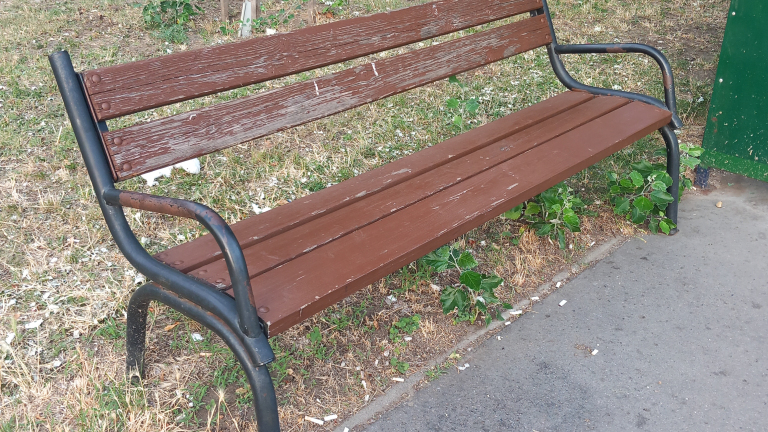 Rózsaligeti 117 es buszmegállónál az utasváró mellett a pad lassan lekopás látható