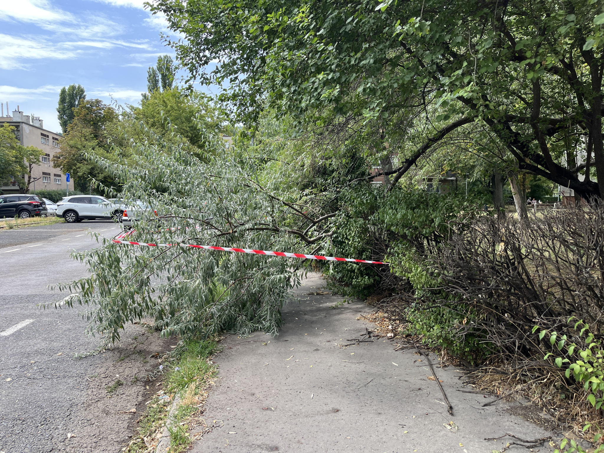 Egy faág letört és rálóg a járdára teljesen elfoglalva azt.