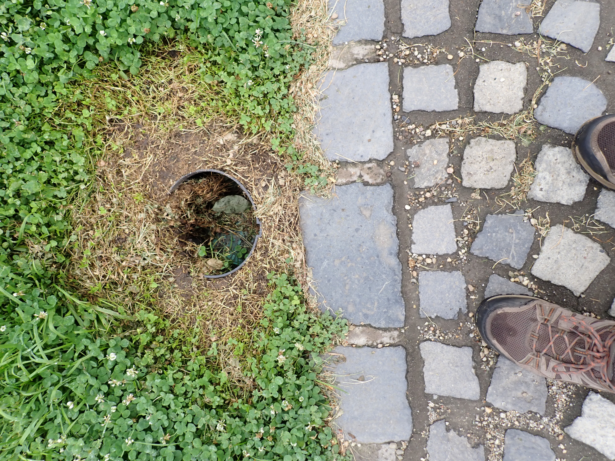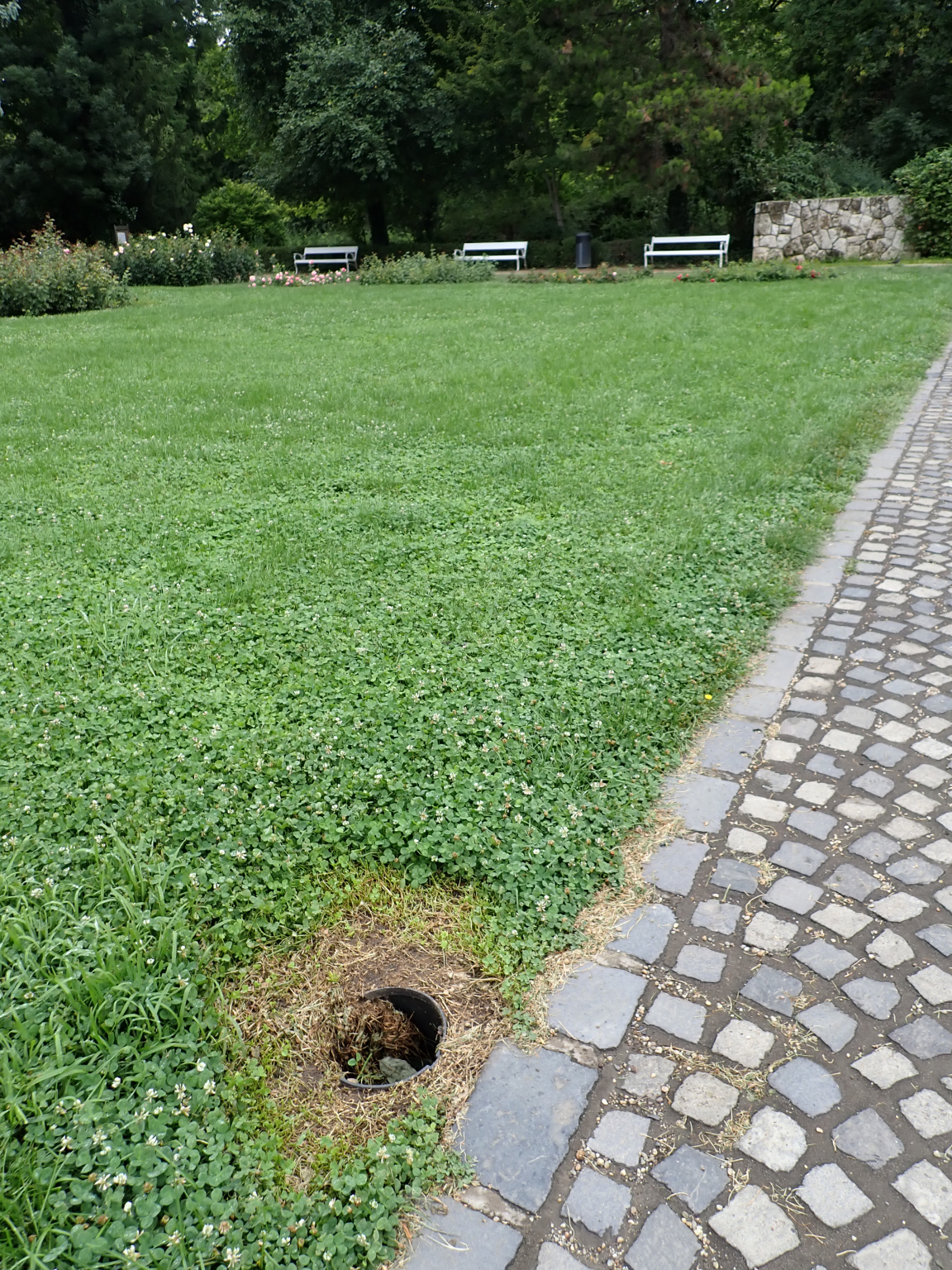 A Margitszigeten, a felső rózsakertet felező út mellett egy locsoló-vízvevőhely fedele eltört és beleesett, veszélyes buktatót, lukat eredményezve.
