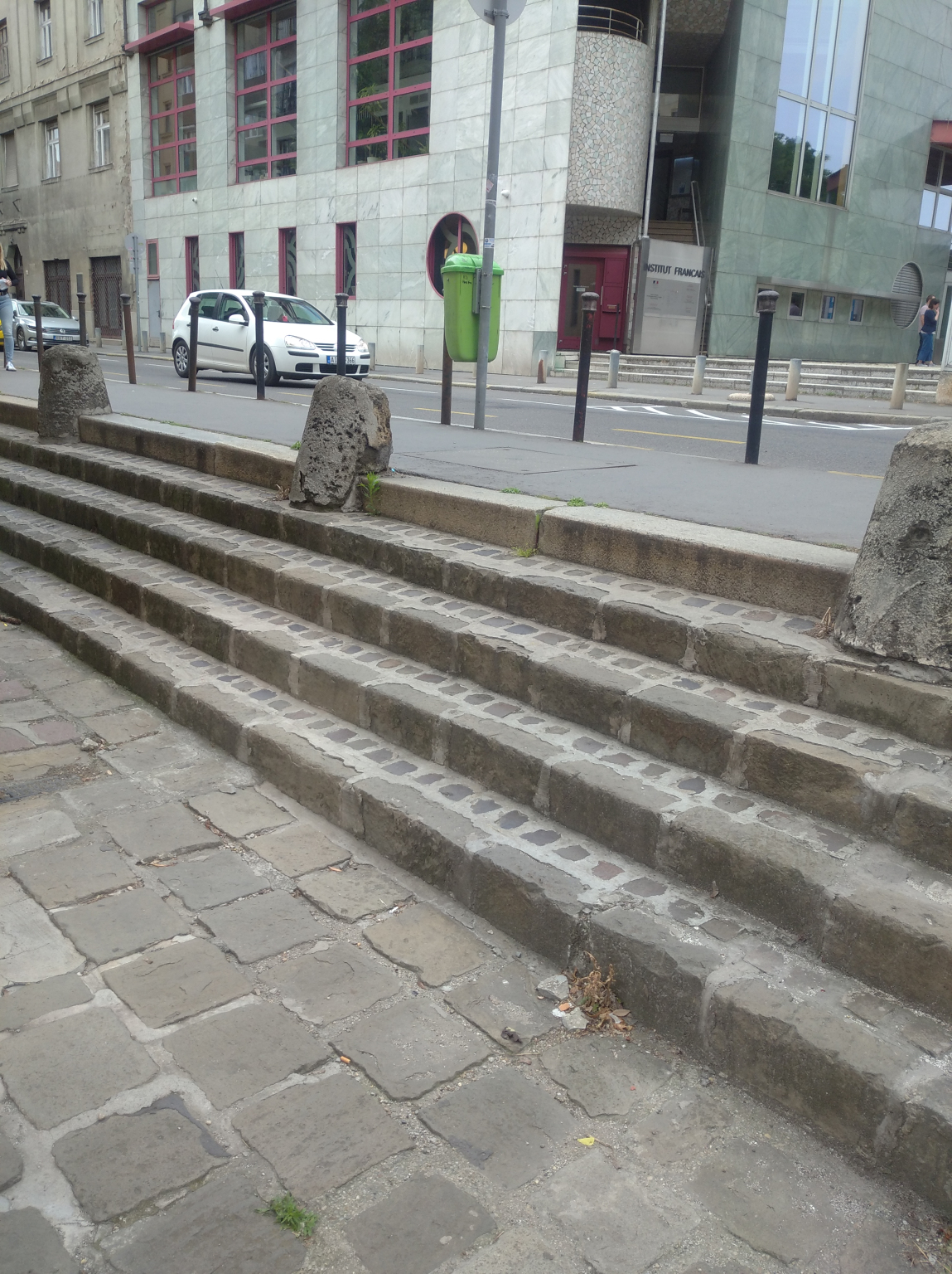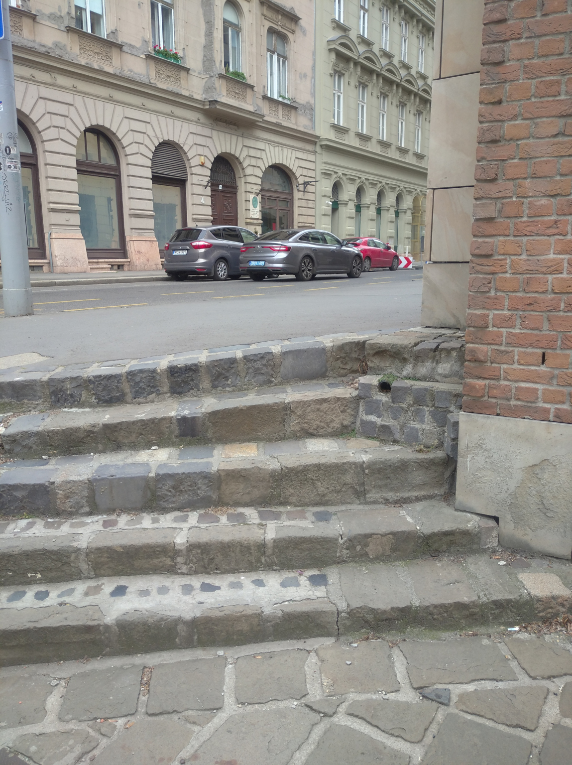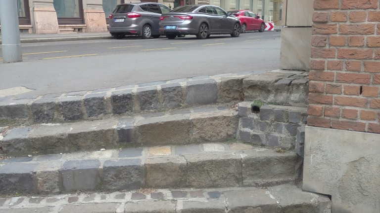 A Pala utca elején a lépcső nagyon magas. Jó lenne a szélére és középre egy korlát.