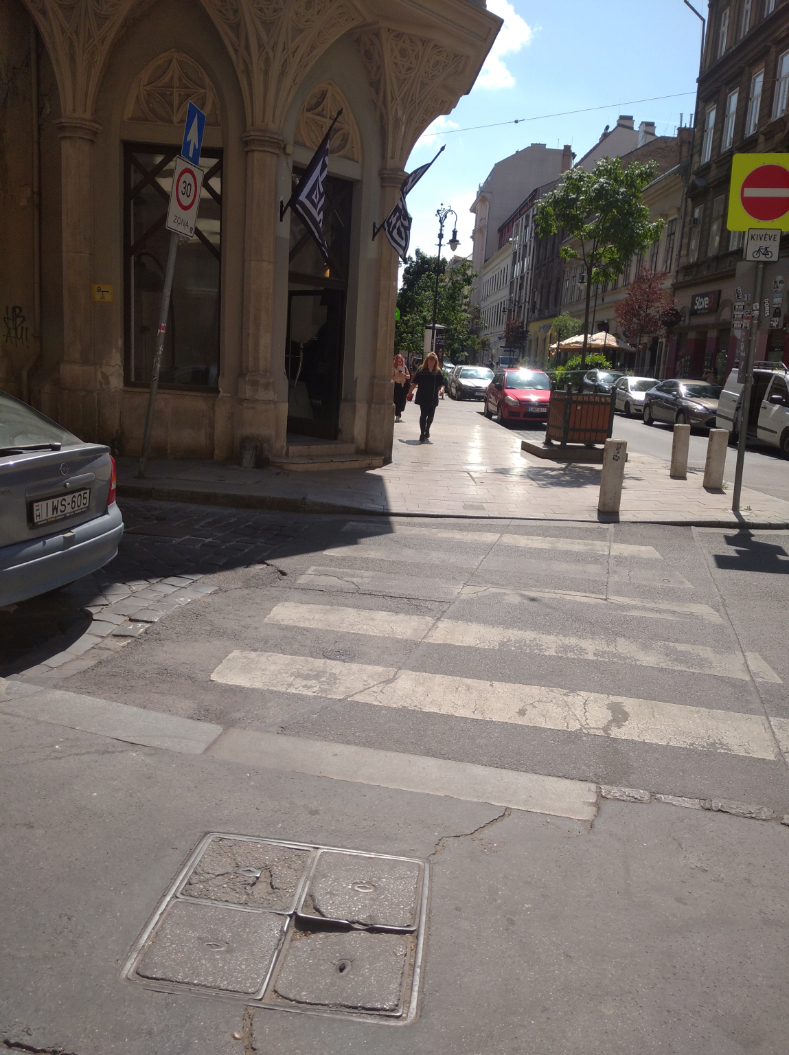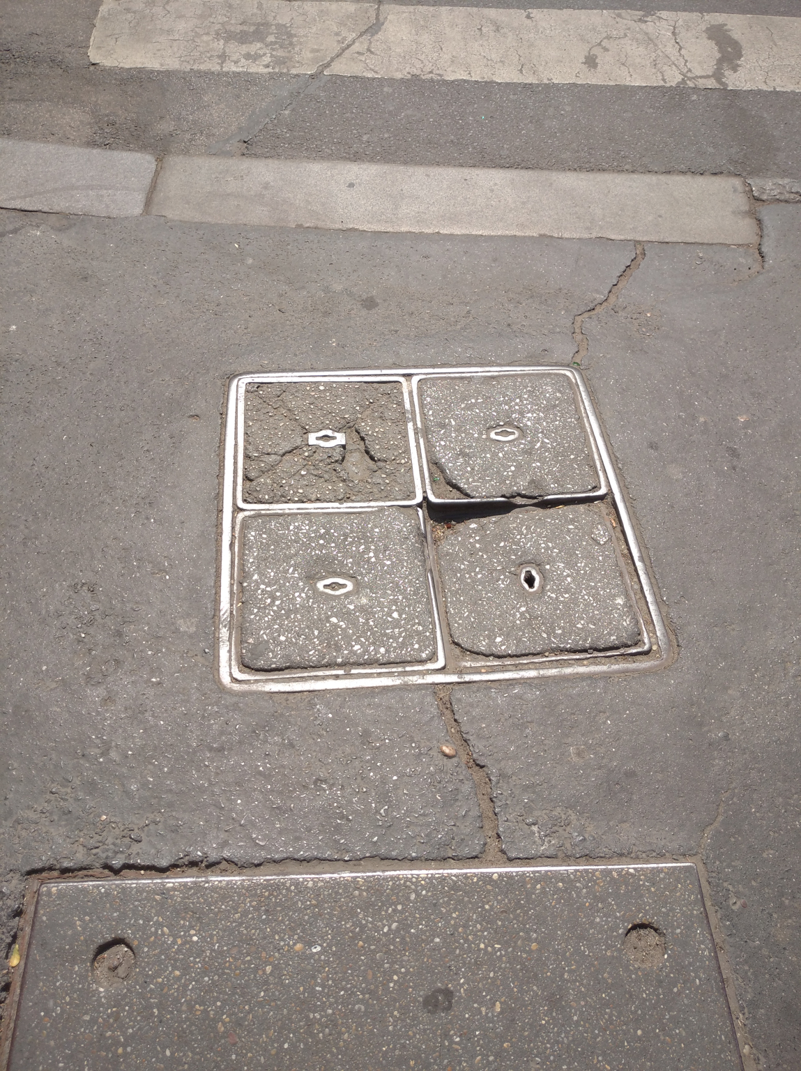 Ismeretlen eredetű fedlap beszakadt a járdán. Balesetveszélyes.