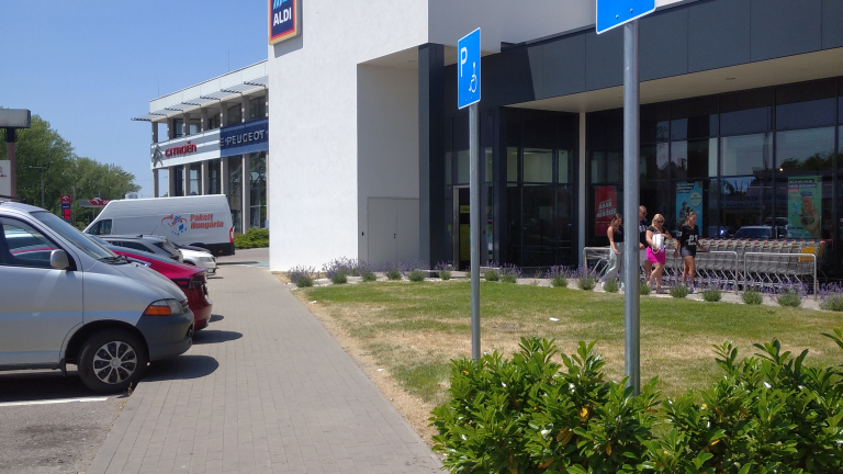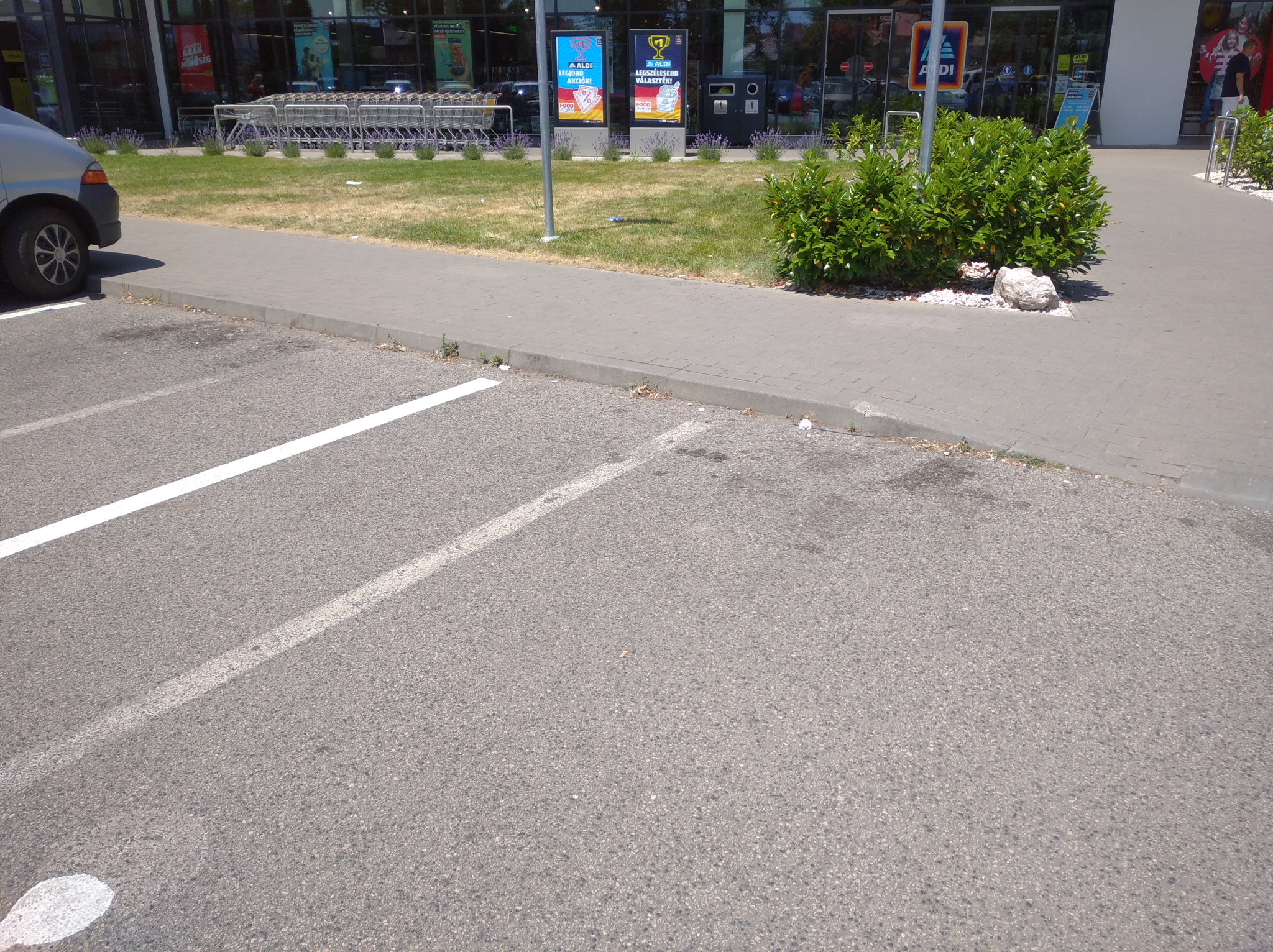 Az Aldi előtt módosították a kerekesszékes parkolóhelyek felfestését. Az áruház előtti járda széle a korábbi helyek előtt van lesüllyesztve. Az új felfestésnél sajnos nincs. Így hiába áll meg ott az autóval egy kerekesszékes, ha nem tud a járdára felmenni. Módosítani kellene a felfestésen vagy a járdát lesüllyeszteni.