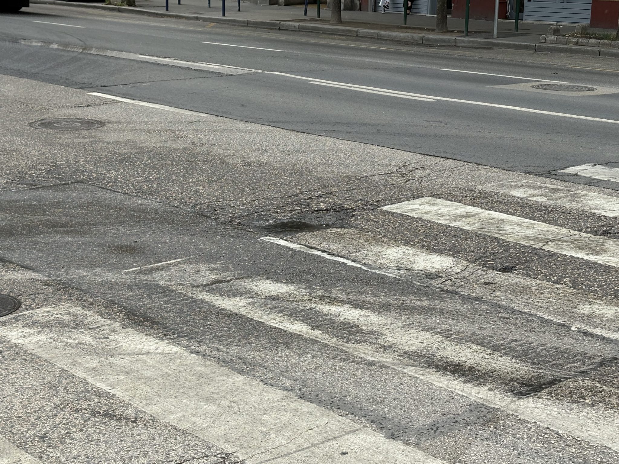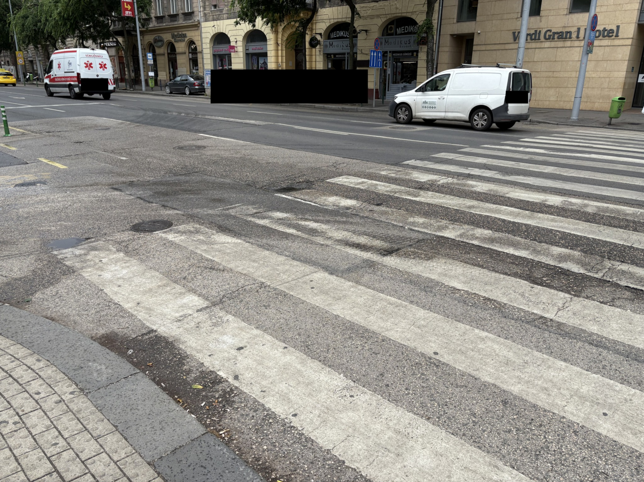 Kátyú a külső sávban a Klinikák metro állomásnál a Corvin felé haladva.