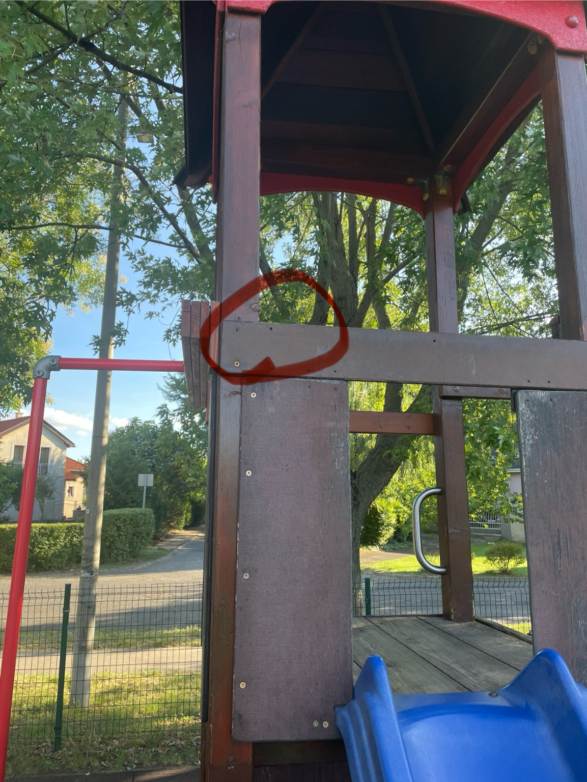 Az elefántos játszótéren a mászóka tetőszerkezetét a vihar megbontotta valószínűleg (csatolmány) illetve a kék csúszda feletti fa korlát bal felső csavarja hiányzik emiatt valamennyire mozog.