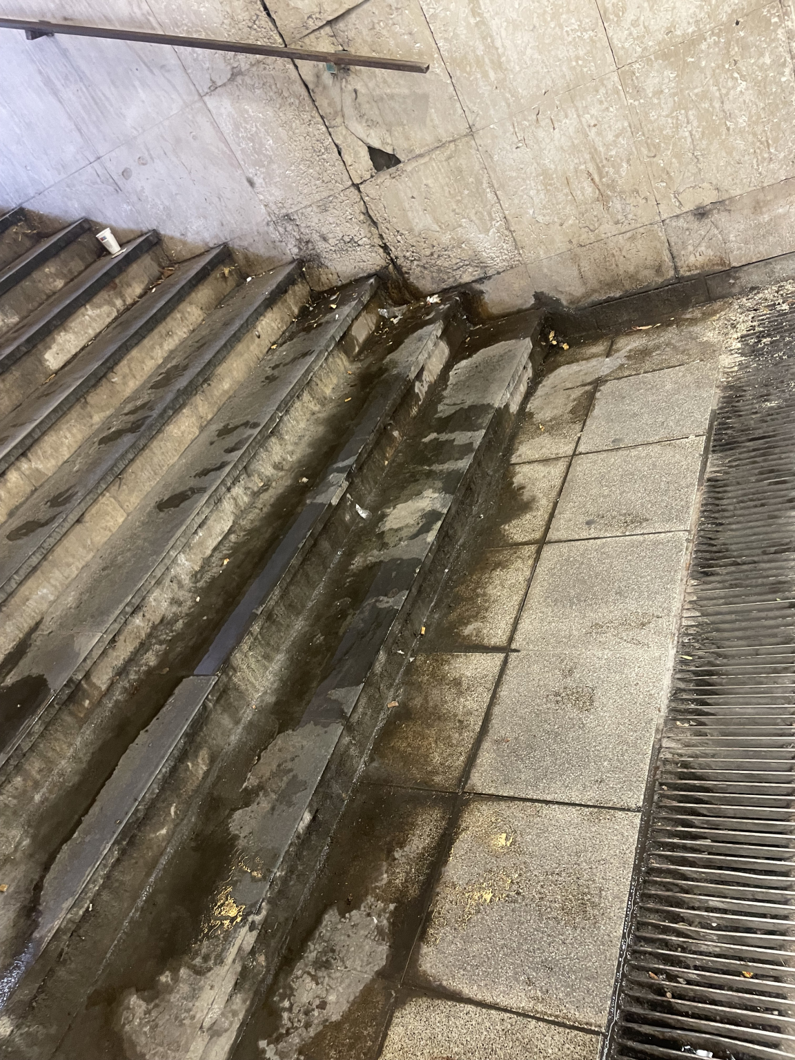 A Batthyány téri aluljáró lépcsőjén ázás tapasztalható, száraz időben is, az aluljáró myilvános WC-je mellett. A lépcső így nyálkás, csúszós, ezért balesetveszélyes és a kifolyás közegészségügyi szempontból is problémás.