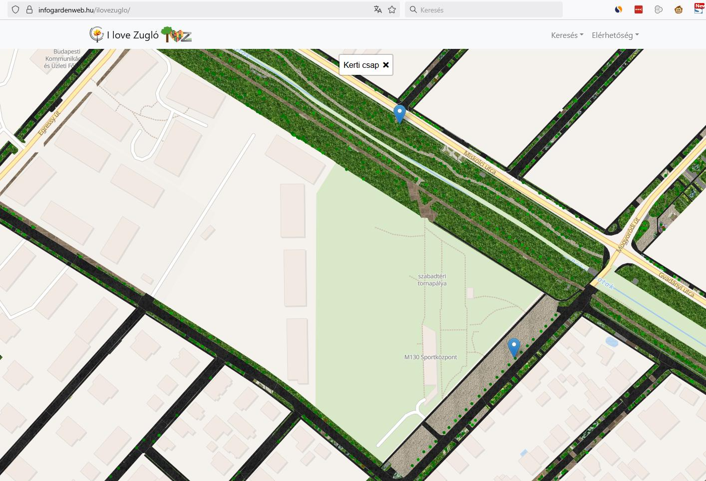 Itt jelzi a térkép, hogy van egy csap az M130 sportpálya parkolójában. (ha épp nem parkol rajta autó)