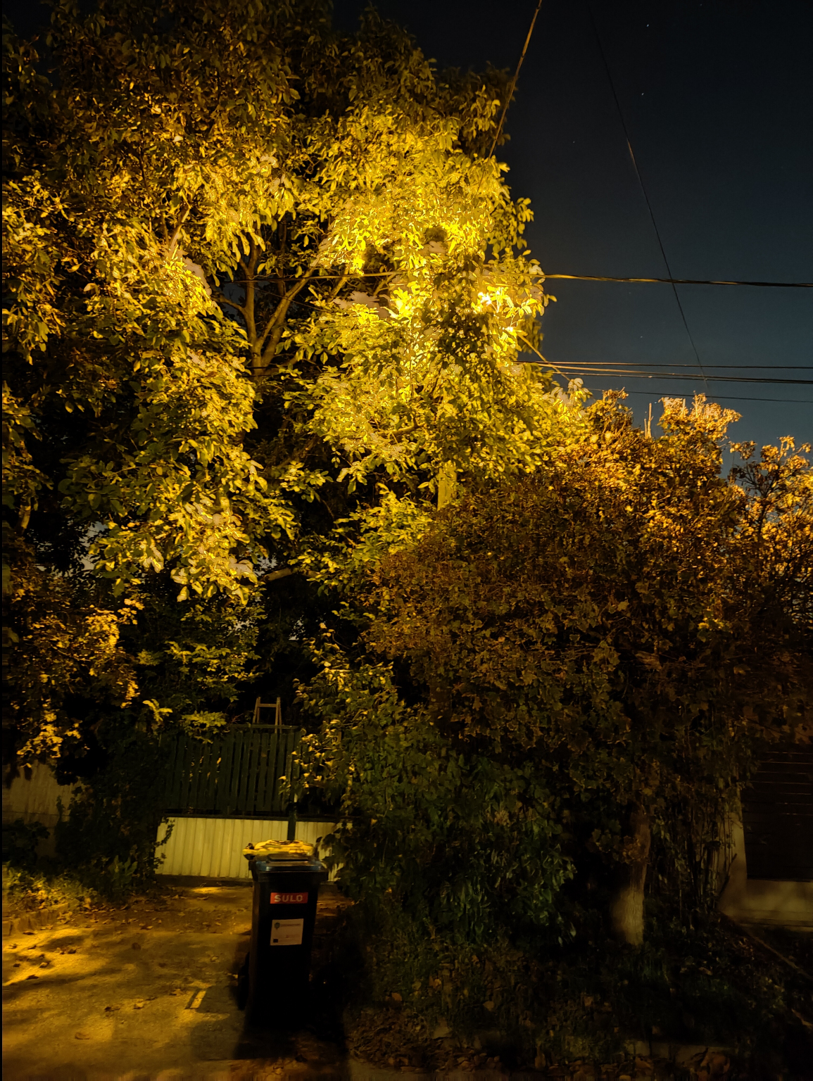 Közvetlenül a lámpa mellett található fa lombja annyira ránőtt a közvilágítást biztosító lámpára, hogy annak a fényét szinte teljes egészében kitakarja!