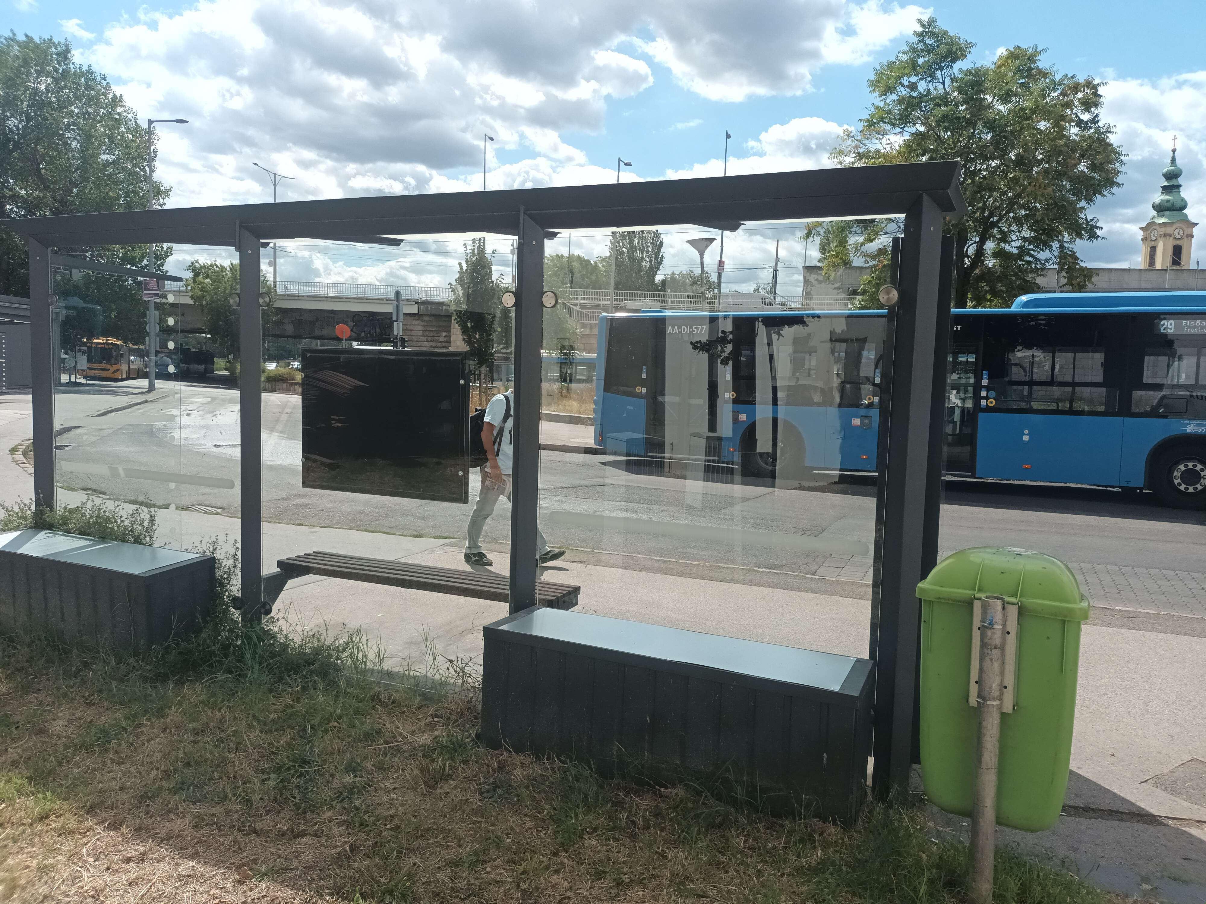 A buszmegálló mögött a ládákba ültetett növények kiszáradtak, valószínűleg senki nem gondozza őket.