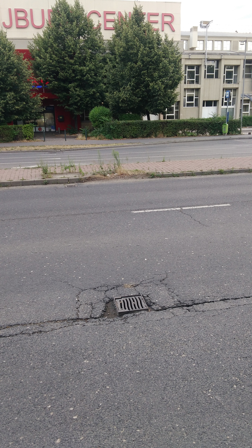 Kérem az illetékest, hogy a képen látható víznyelő legyen kedves szintbe hozni az úttal, és egyben pótolni a hiányzó aszfaltot is! Munkájukat előre is köszönöm!