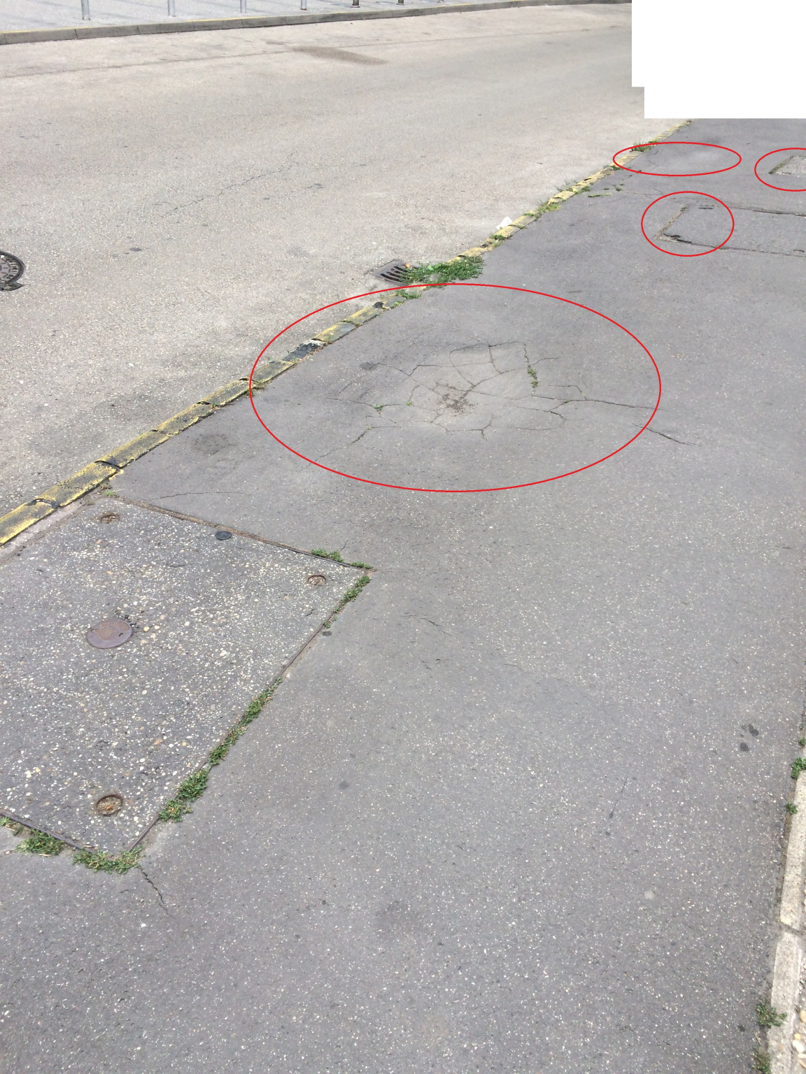 Jelzett helyszínen lévő járda borzasztó állapotú, több helyen beszakadt, ferde, a fedlapok körül hibás, botlásveszélyes. A sárga szegélyfelfestés teljesen lekopott.
