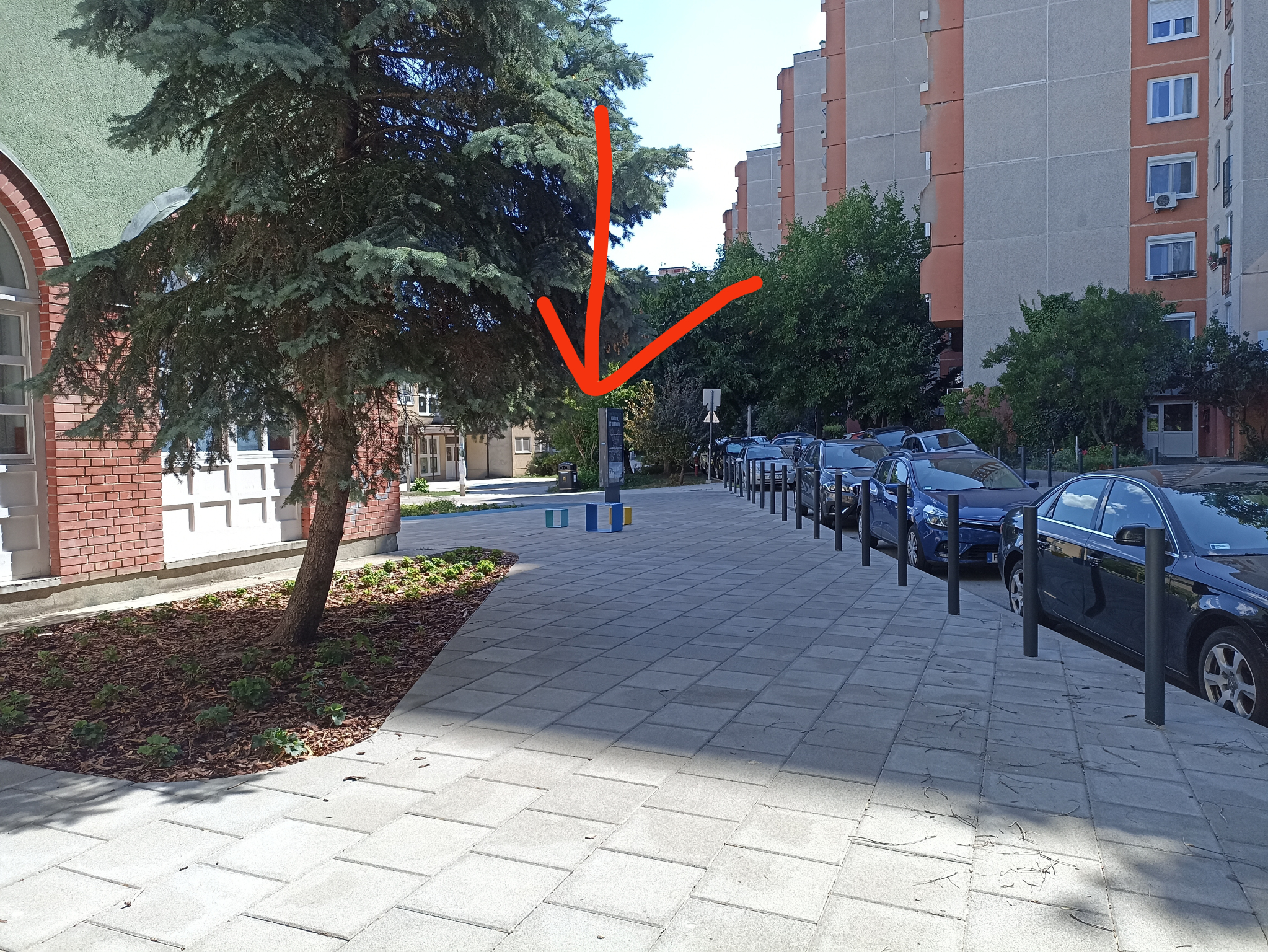 A Törökugrató iskola sarkánál elhelyezett utcabútorok nagyon belógnak a járdába, holott oldalt rengeteg hely lenne nekik.