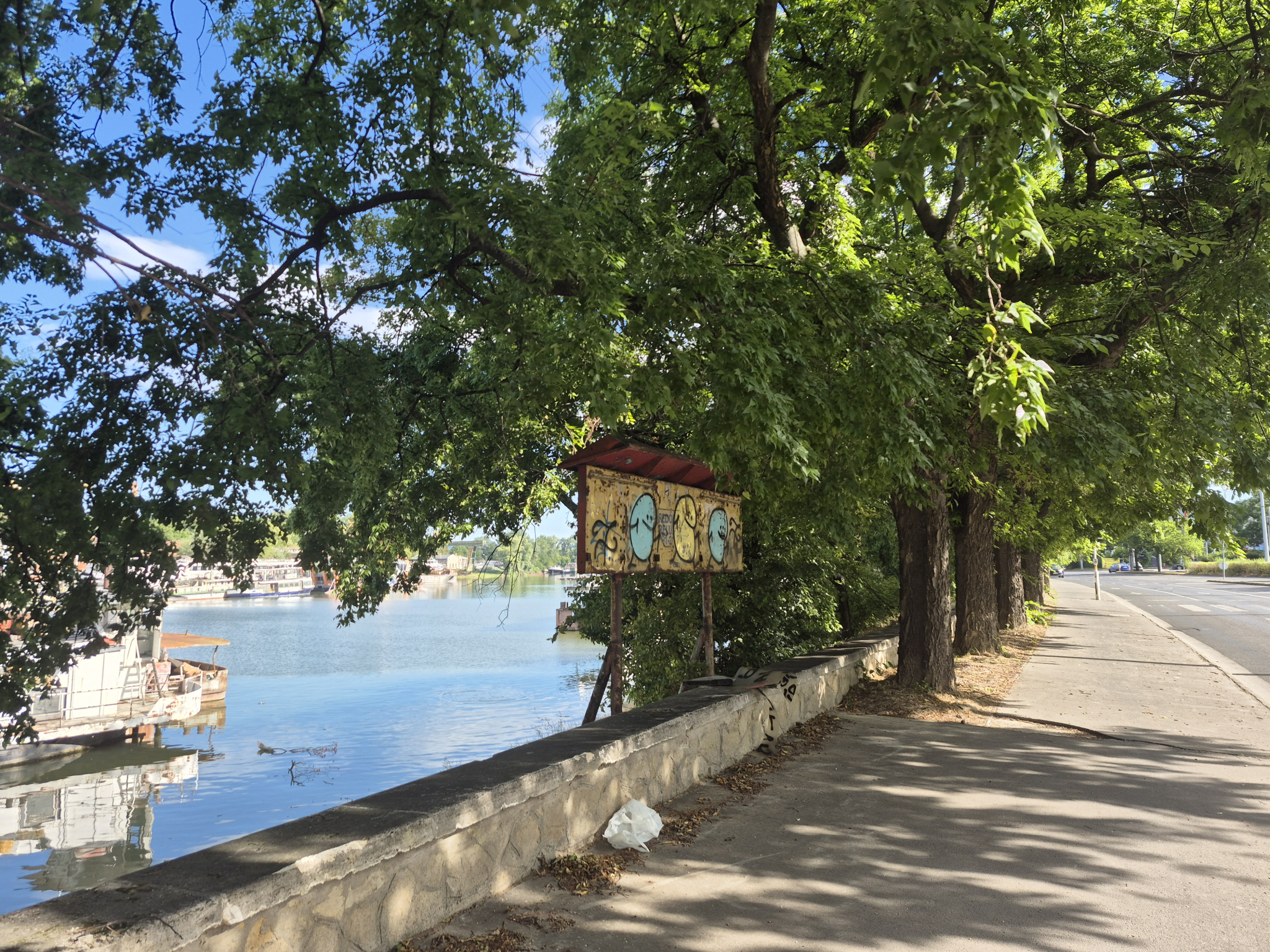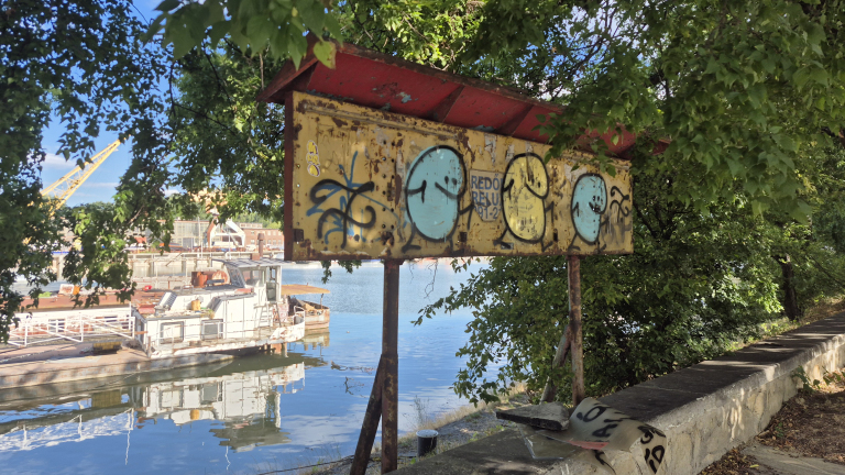A hajójavító mellett ez az elhanyagolt hirdetőtábla található mellette sok szeméttel.