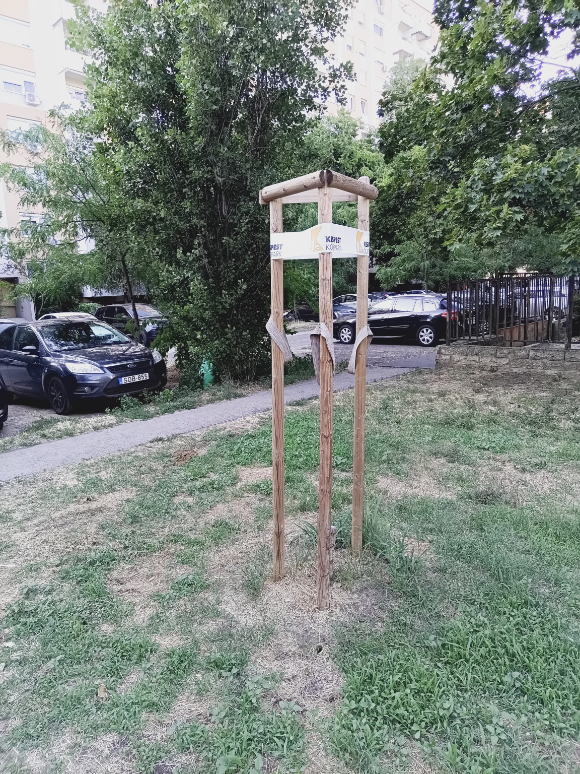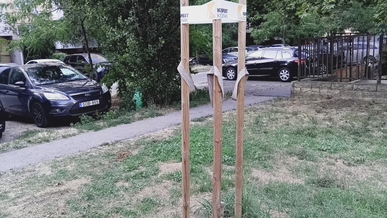 A Dobó Katica utca-Arany János utca közötti közben 3 db fát kivágtak, majd a fákat rögzítő elemeket egy éve itt felejtették.