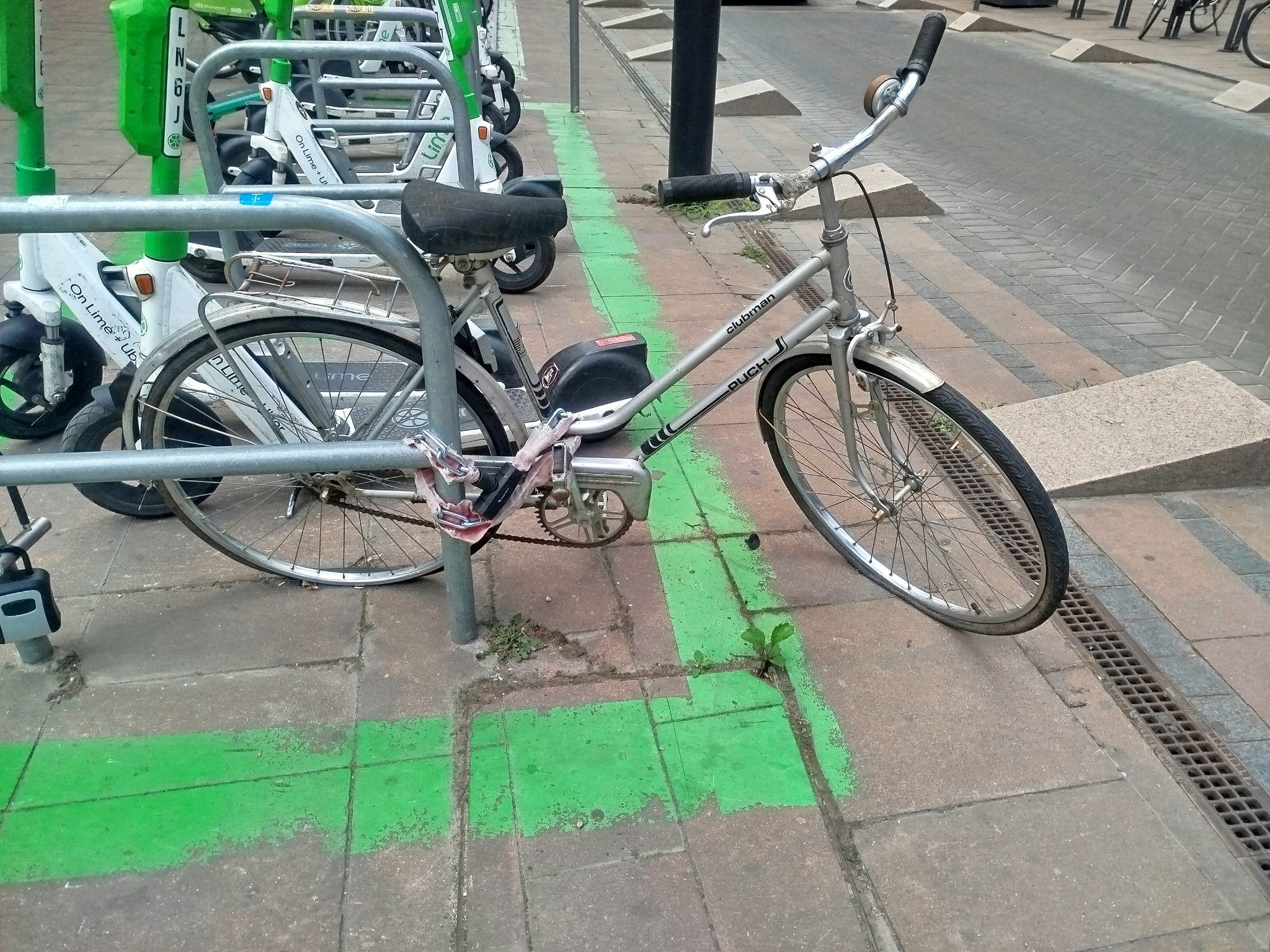 A képen látható kerékpár legalább 1 éve ugyanott, defektes, rozsdás.