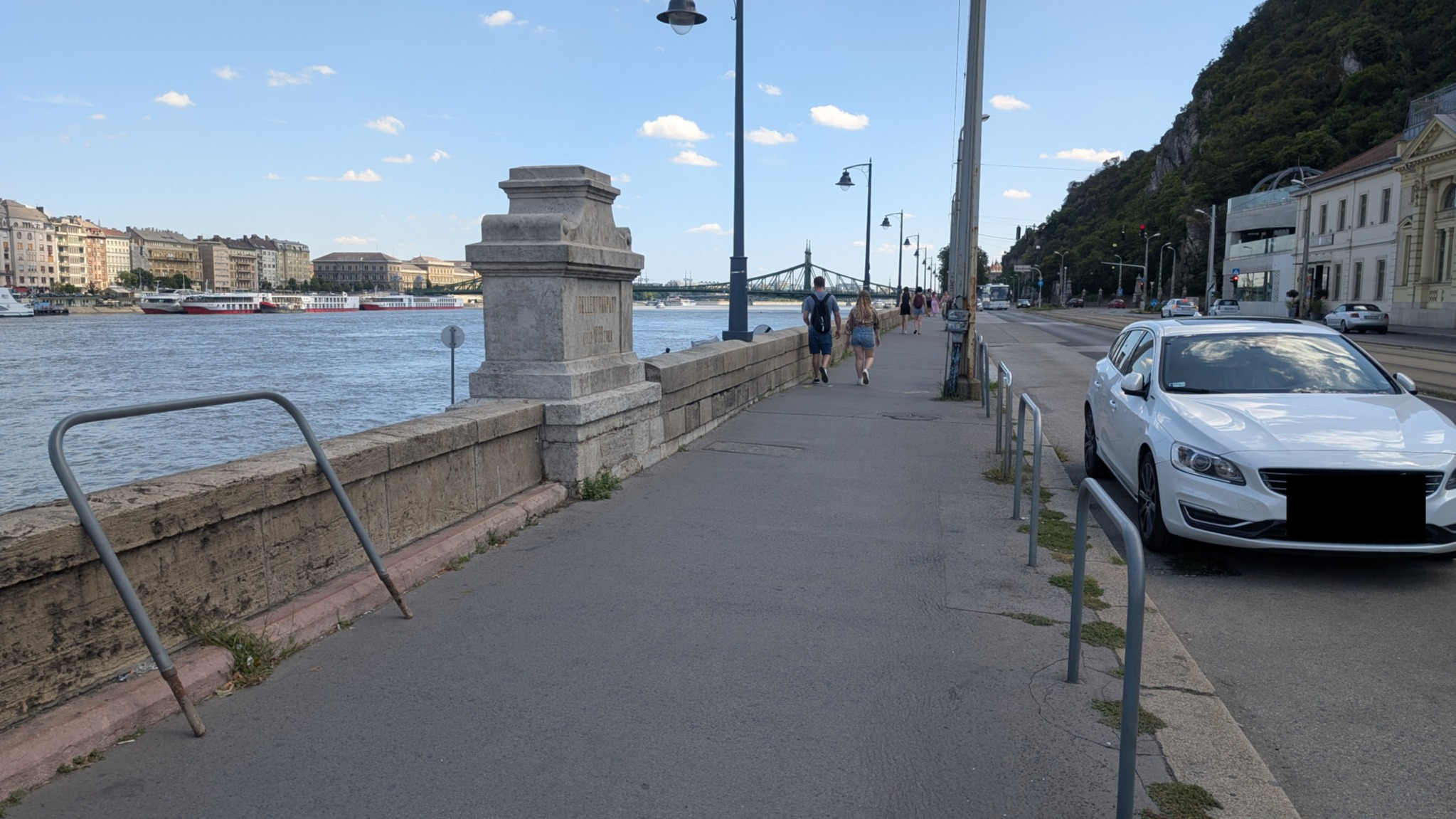 A Rudas fürdő magasságában egy korlát hever a járda szélén.