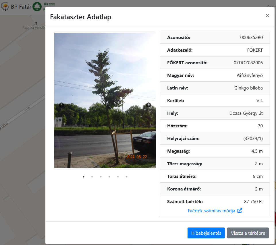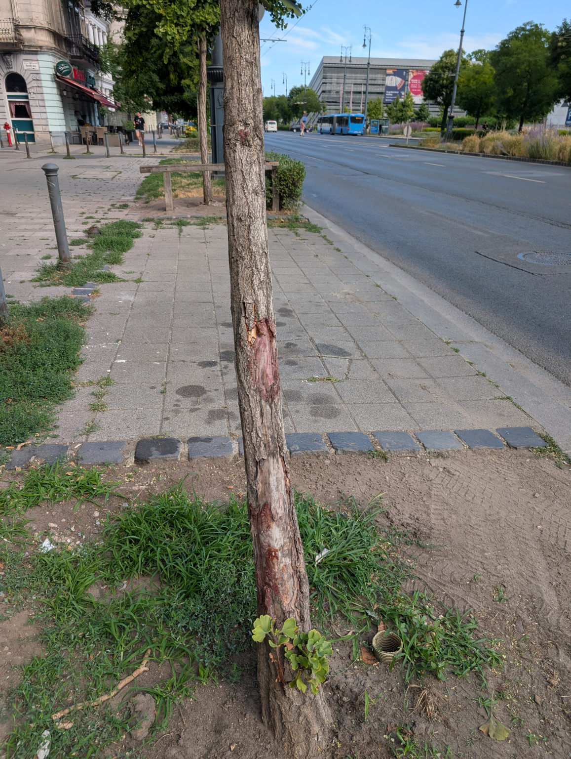 A Dózsa György út 70 előtt áll 2 fa, aminek rendszeresen neki mennek a parkoló autók. Sajnos már a kérgük is sérült nagy területen hiányzik ami a fa kipusztulásához vezethet.